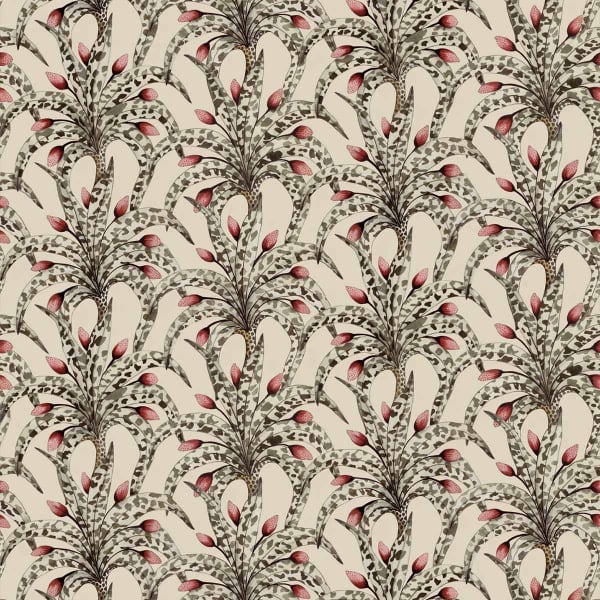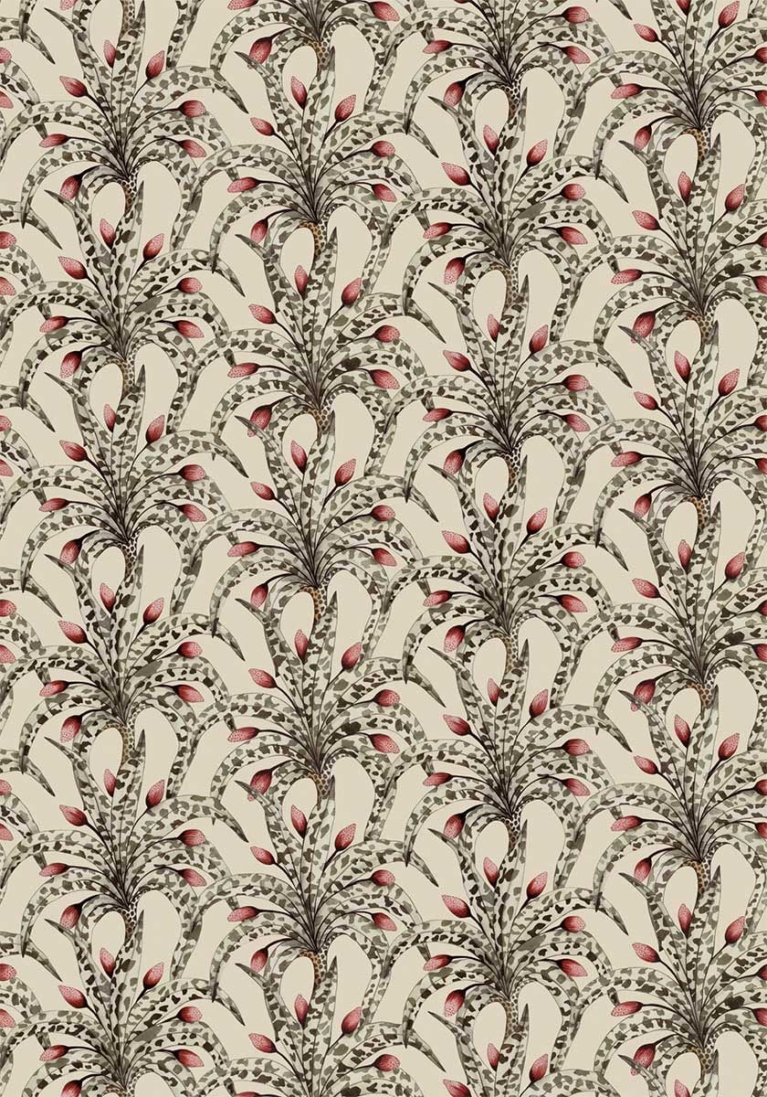 Les grandes palmes stylisées du papier peint Afrika Damask surgissent en faisceaux réguliers, ponctuées de bourgeons graphiques. Le motif végétal, dessiné comme un damassé, oscille entre exotisme et rigueur classique. L’effet de répétition crée un rythme presque architectural. Peint à la main, ce modèle signé Cole and Son exprime la richesse d'une nature réinventée.