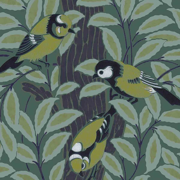 Le Chant des oiseaux présente des mésanges perchées parmi un feuillage foisonnant. Ce papier peint signé Isidore Leroy s’appuie sur un dessin réinterprété à la main. Le motif alterne lignes franches et aplats, dans une composition rythmée et graphique. La nature devient décor, entre poésie animalière et stylisation ornementale.