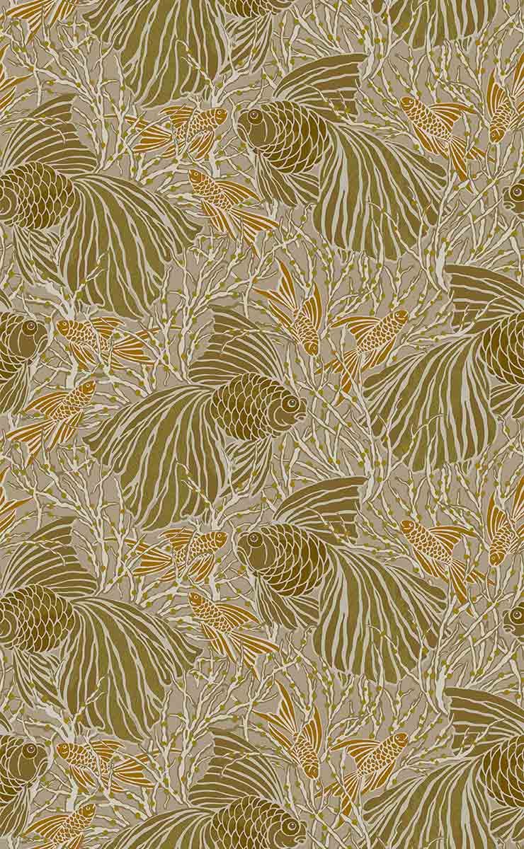 Le papier peint Cyprins affiche un décor aquatique peuplé de poissons stylisés aux nageoires déployées. Libres et rythmiques, ils ondulent entre des algues aux ramifications graphiques. Le dessin compose une scène vibrante aux contours ciselés, comme une fresque vivante sur les murs. Inspiré d’une gouache historique, ce revêtement signé Isidore Leroy évoque un monde suspendu et paisible.