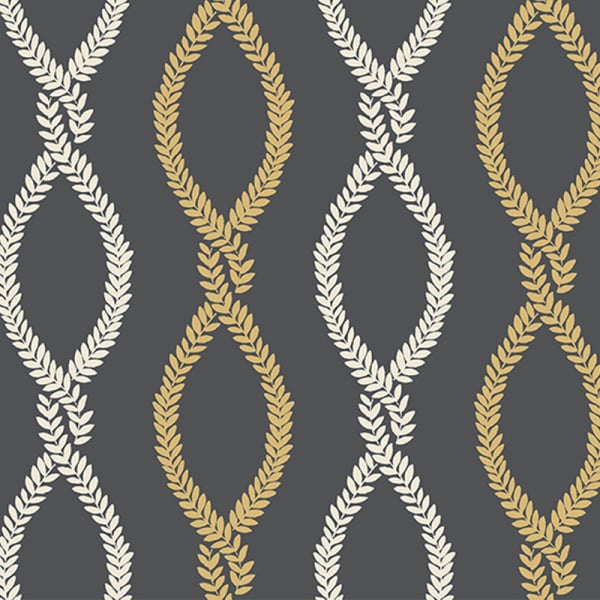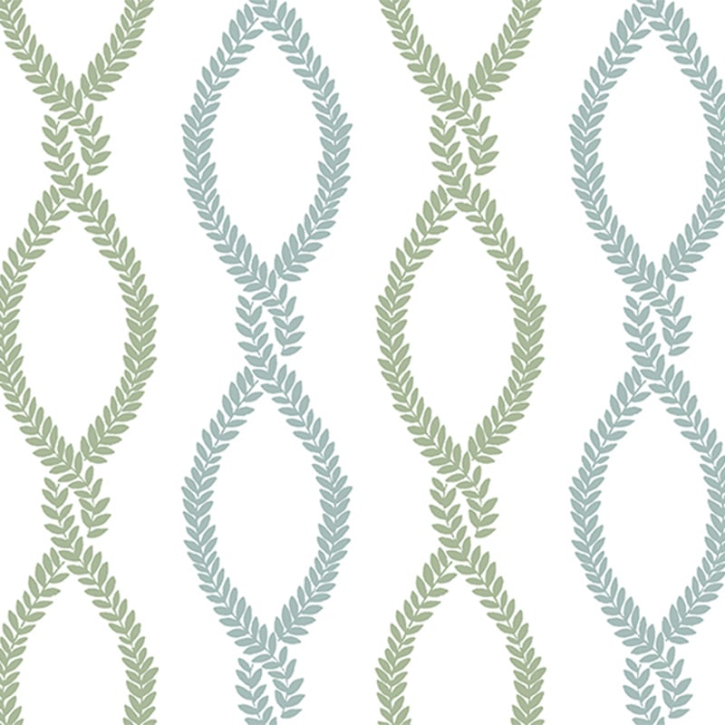 Le papier peint Laureate révèle un motif végétal dessiné avec finesse. Des guirlandes de lianes, formées de petites feuilles symétriques, s’enchevêtrent verticalement pour composer un réseau de losanges allongés. Cette régularité donne l’illusion d’un entrelacs tressé, dont le rythme fluide accompagne la hauteur des murs. York Wallcoverings insuffle à cette composition ornementale un charme graphique tout en douceur.