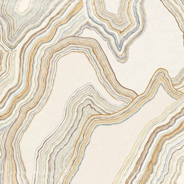 Masureel dévoile le papier peint panoramique Dirillo, dont les lignes sinueuses tracent un paysage de strates ondoyantes. Chaque courbe esquisse la mémoire d’un relief ancien, dans une composition fluide et presque minérale. Le motif, entre cartographie imaginaire et coupe géologique, évoque un mouvement souterrain. Le dessin se déploie en larges ondulations, porté par une main précise.