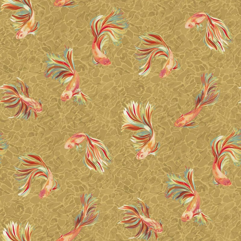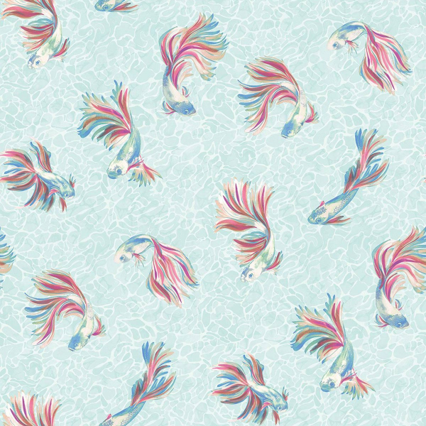 Osborne and Little compose avec Aquaria un papier peint à la grâce ondoyante. Sur une trame évoquant le miroitement de l’eau, s’épanouit un ballet de poissons aux nageoires déployées, dessinés avec minutie. Leurs longues queues flottent comme des rubans dans un courant invisible. Le motif, fluide et vivant, insuffle au mur une sensation de mouvement continu.