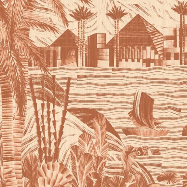 Arte signe avec le papier peint Thebe une fresque vibrante inspirée des rives du Nil. Palmiers effilés, pyramides stylisées et silhouettes modernes dessinent un paysage entre rêve et mémoire. Parmi les feuillages, fleurs et poissons se glissent en silence dans ce paysage dense et foisonnant. Le revêtement, en jute tissé fil-à-fil, accentue la profondeur du motif narratif.
