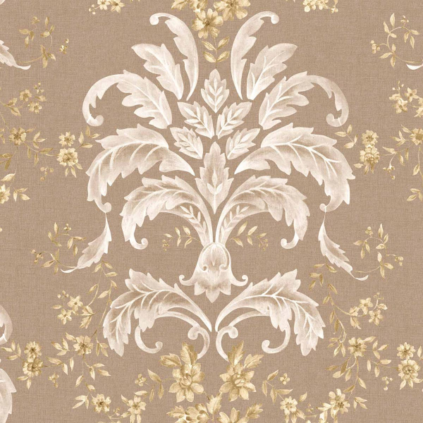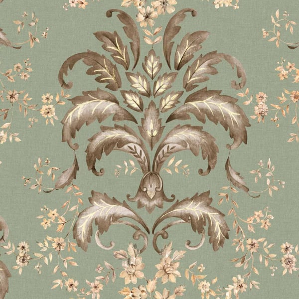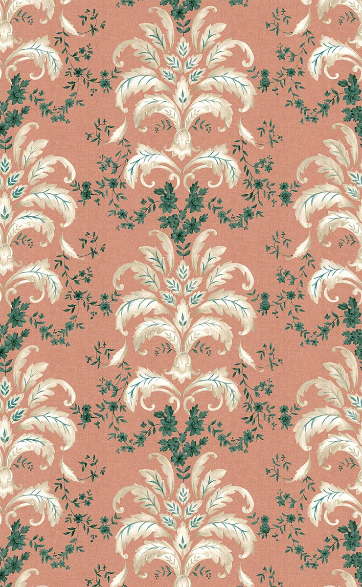 French Damask compose un motif floral ample où une palmette structurée déploie des feuilles d’acanthe aux nervures marquées, encadrée de rinceaux souples et de guirlandes fleuries. De fines corolles, insérées entre les courbes, accompagnent les volutes et renforcent la continuité du réseau végétal. Signé Coordonné, ce papier peint imprime un rythme vertical régulier. Il s’inscrit dans la tradition décorative française avec maîtrise et profondeur.