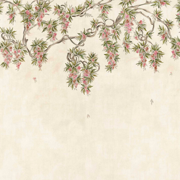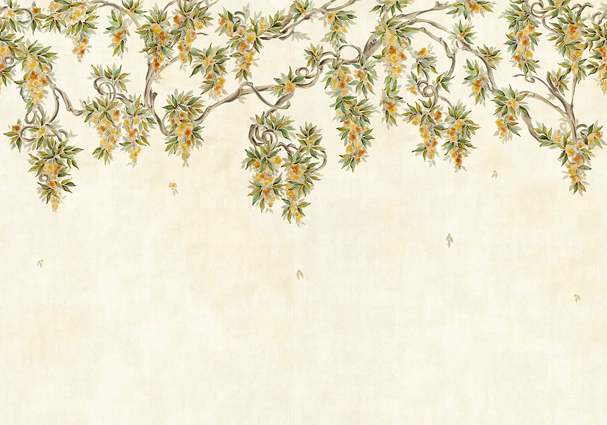 Abril est un papier peint panoramique de Coordonné, où des branches sinueuses se déploient sur un fond patiné. Des grappes florales délicates y pendent en cascade, entourées d’un feuillage finement dessiné qui anime la surface. Le trait évoque une peinture à la main, avec des contours nuancés et une composition aérée. L’ensemble crée une scène végétale suspendue, où le regard circule entre arabesques et floraisons.