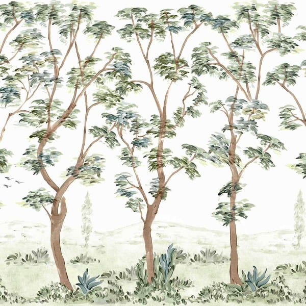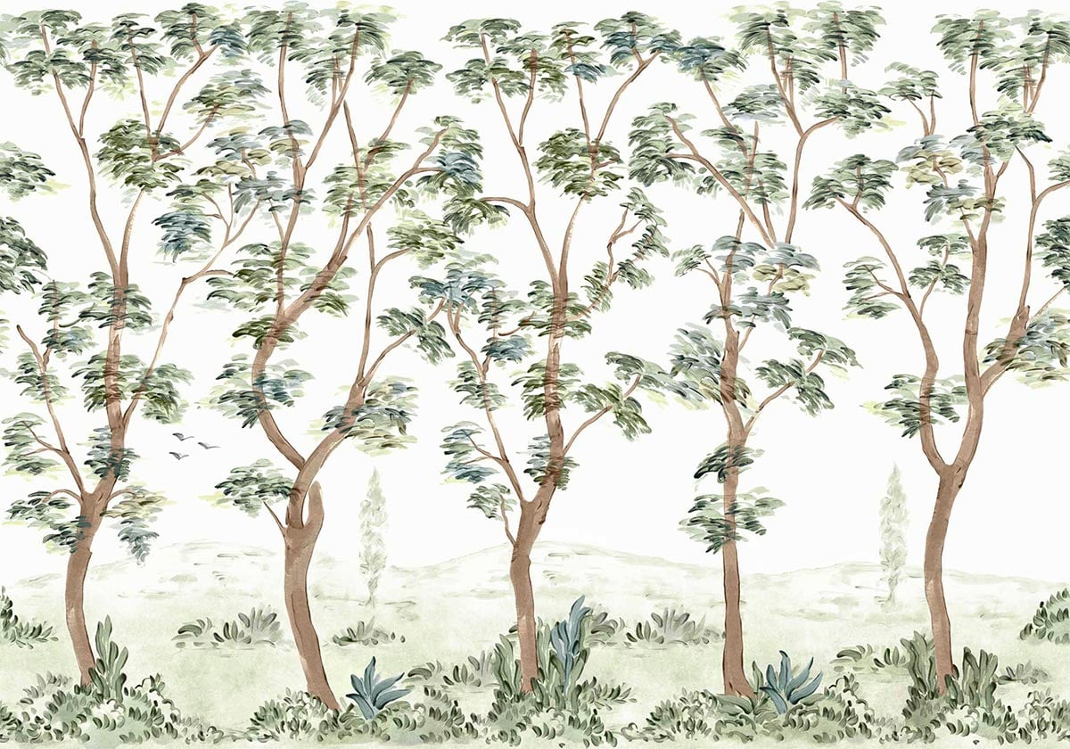 Le papier peint panoramique Cartuja de Coordonné affiche un paysage arboré aux lignes souples, où de hauts troncs élancés s’élèvent avec légèreté dans une composition aérée. Le dessin, traité dans un esprit pictural, esquisse des frondaisons vaporeuses qui semblent vibrer doucement dans l’espace. Au premier plan, un sous-bois stylisé déploie ses feuillages, tandis qu’à l’arrière-plan se devinent des reliefs diffus et quelques oiseaux en vol.