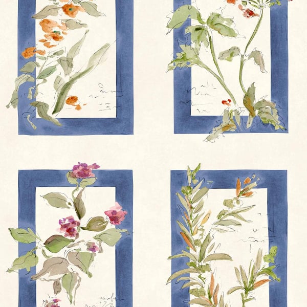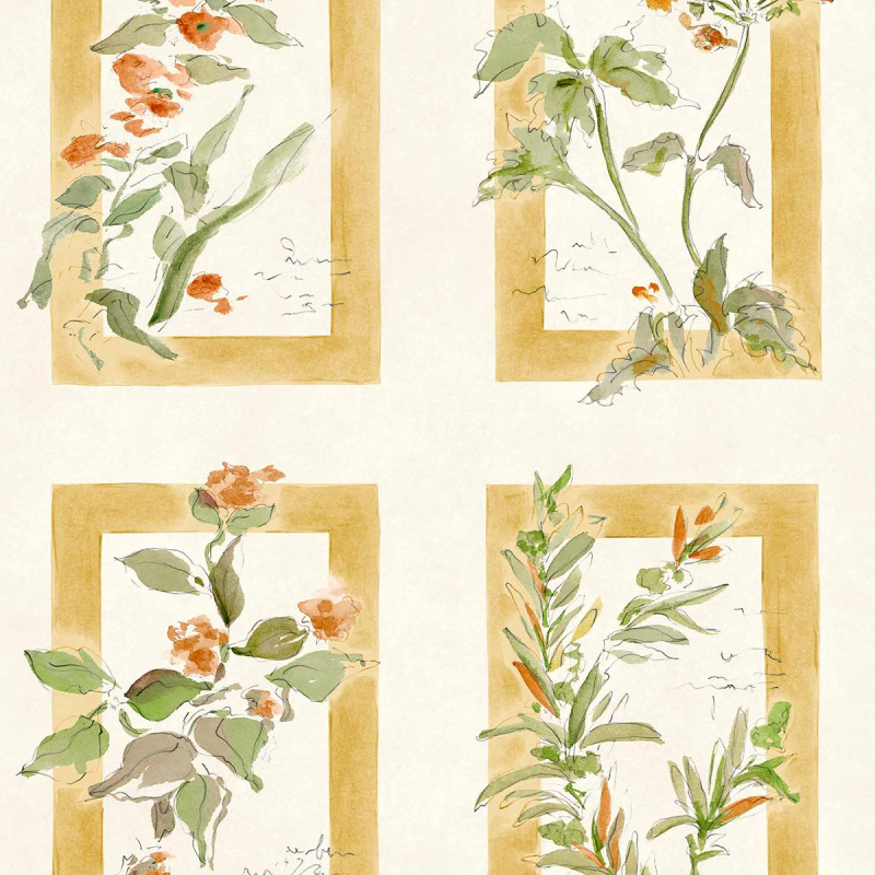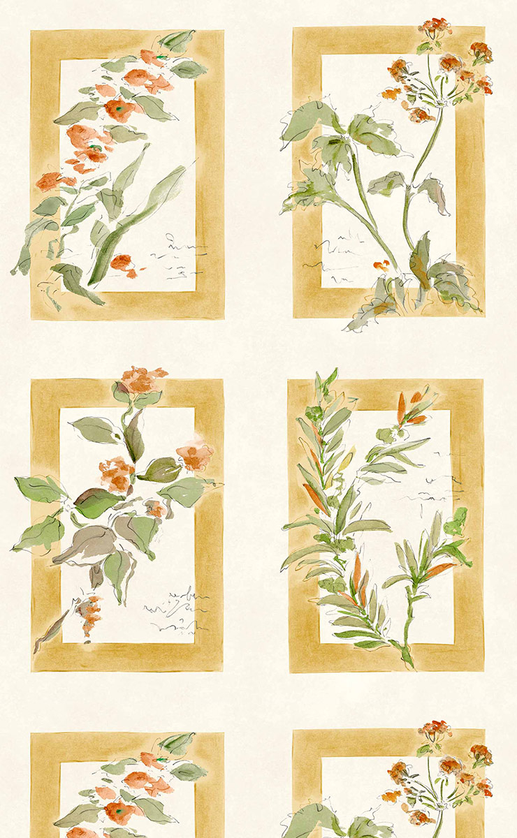 Sta Cruz de Coordonné est un papier peint qui déploie une composition florale inspirée de planches botaniques. Quatre encadrements structurent la surface, chacun révélant une tige élancée, des feuilles souples et des corolles délicatement esquissées, comme tracées à l’aquarelle. Le dessin mêle contours libres et lavis nuancés, laissant apparaître le grain du papier et la spontanéité du geste. L’ensemble évoque un herbier poétique où la végétation semble flotter dans un calme lumineux.