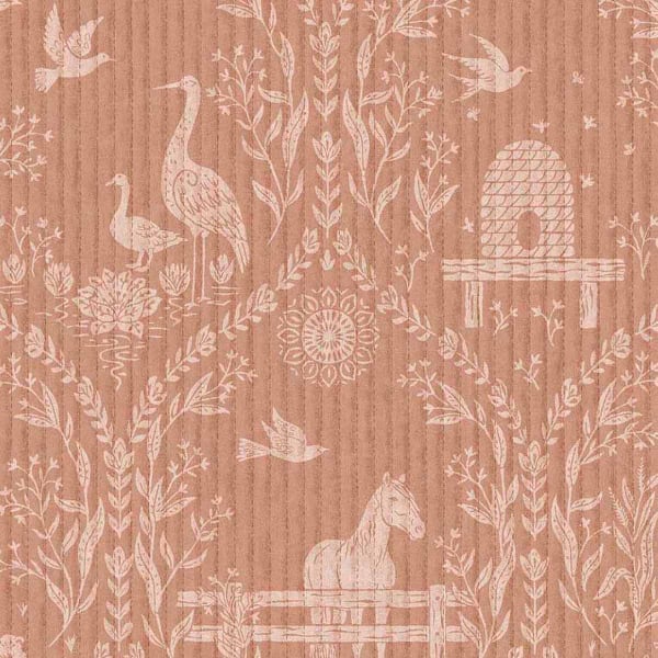 Le papier peint Homestead signé Eijffinger présente un motif figuratif à la narration champêtre. Des paons, des oiseaux en vol et de petits pavillons s’inscrivent dans une composition symétrique. Des guirlandes végétales forment des arches qui encadrent bancs et éléments d’architecture. Le dessin, finement structuré, évoque un décor pastoral ornemental.