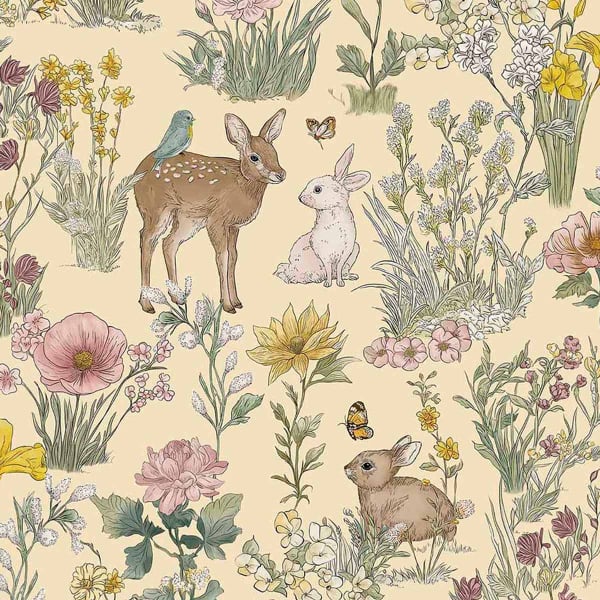Eijffinger présente Wonderland, un papier peint au motif champêtre peuplé d’animaux et de fleurs des prés. Un chevreuil se tient parmi les herbes, tandis qu’un lapin et un oiseau animent la scène d’une présence paisible. Autour d’eux, tiges fines et corolles détaillées composent un décor foisonnant. Le dessin précis structure l’ensemble et inscrit le mur dans une narration bucolique.