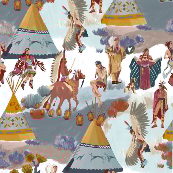 Sur le papier peint Thunderbird, Gastón y Daniela déploie un motif figuratif inspiré des peuples autochtones d’Amérique. Tipis, cavaliers et personnages rituels prennent place dans un paysage habité et des scènes, riches en détails. Chaque silhouette s’inscrit dans une composition narrative aux lignes souples et précises. L’ensemble forme une fresque vivante où l’imaginaire et la mémoire se rejoignent.