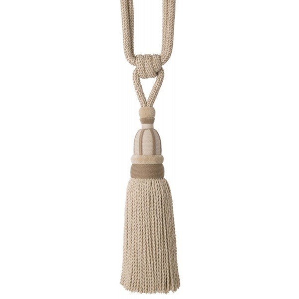 Cette embrasse de rideau est un passement Houlès orné de pompons à franges. Il est proposé dans des teintes neutres et des coloris plus foncés.