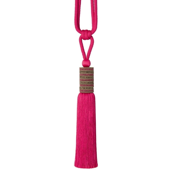 Alternant perles de verre et anneaux de bois, ce passement Houlès se distingue par son originalité. Ses longues franges fines et souples accompagnent élégamment le tombé d'un rideau.