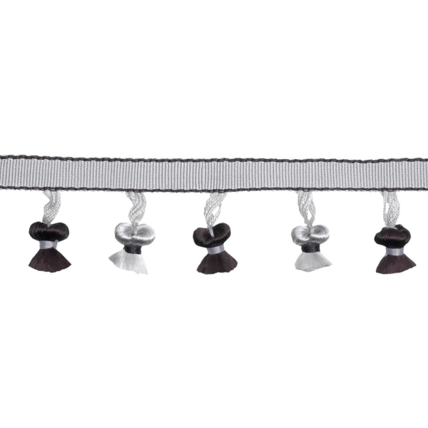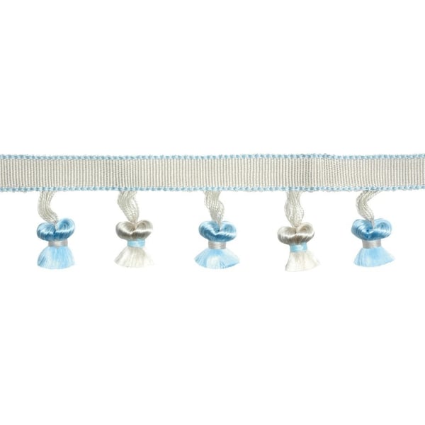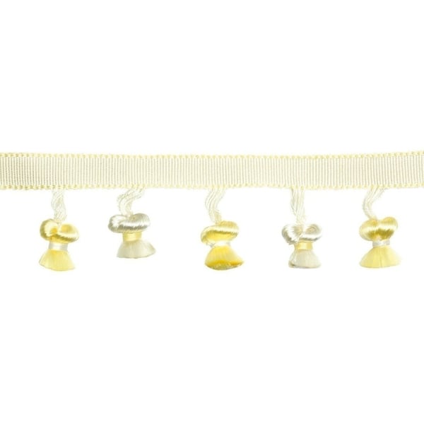La frange pompons Lily est un galon plat jalonné de petits pompons. L'alternance des couleurs des pompons ainsi que les fines rayures bordant le galon apporte une touche de sophistication à vos coussins, sièges et habillages de fenêtre.