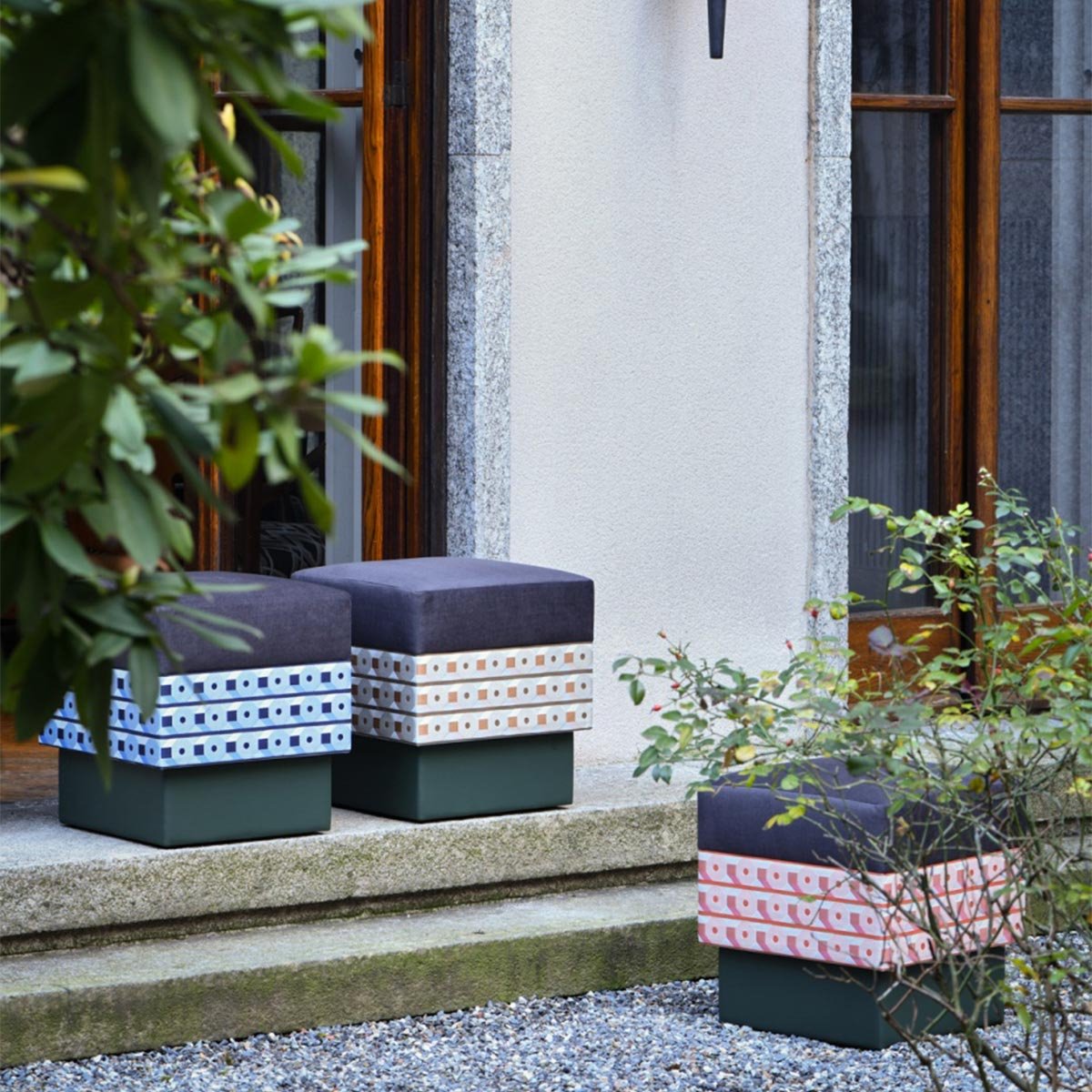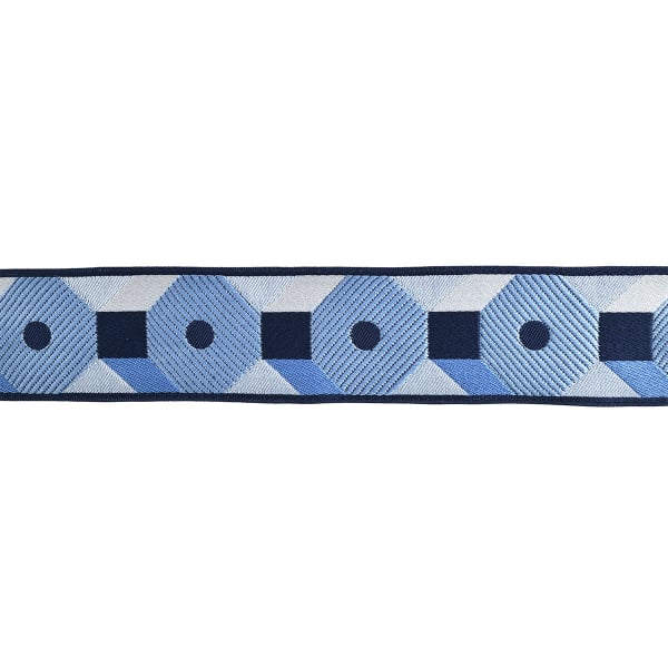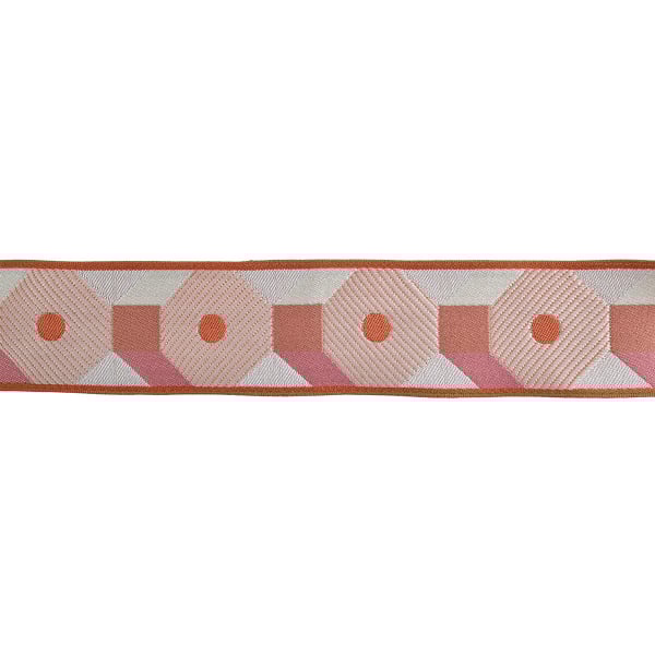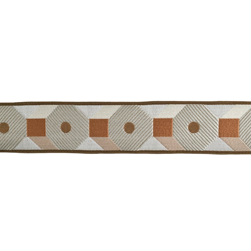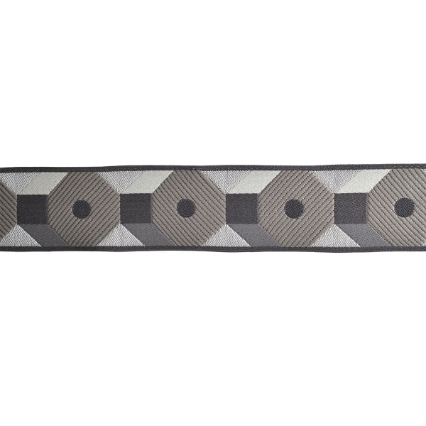 Houlès propose une véritable parure avec Giacomo, un galon satiné dessiné par l’architecte d’intérieur Mickael Aiduss. Il accroche le regard avec une rivière de gemmes encadrées chacune d’un serti masse hexagonal. Le motif, tissé au métier jacquard, semble inspiré des ceintures antiques ornées de pierres précieuses. Il magnifie les intérieurs avec l’éclat du coton mercerisé, pour un rendu résolument contemporain.