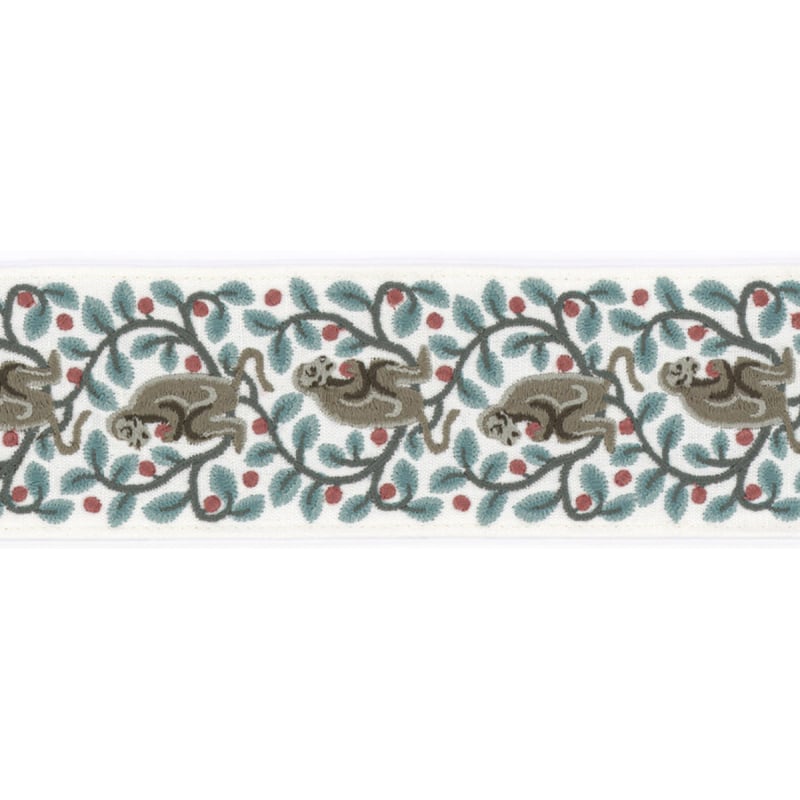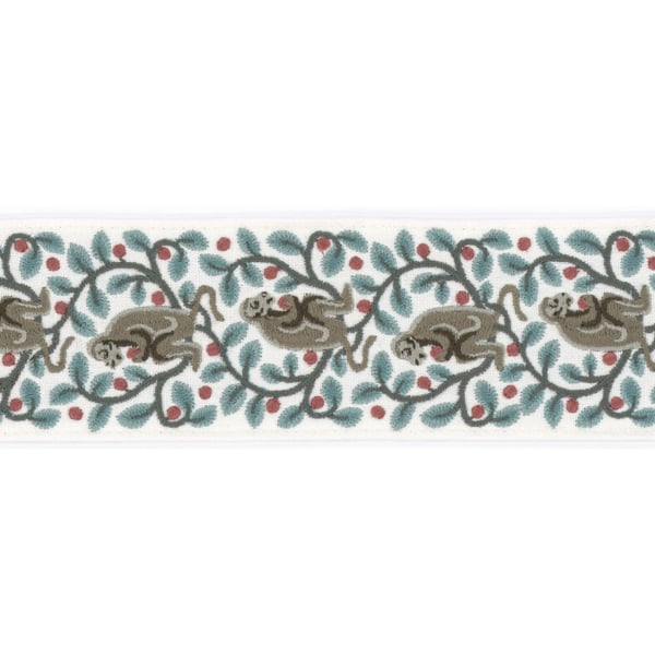 Avec Monkey Business, Zimmer + Rohde signe un galon au motif ludique. Il représente deux singes malicieux qui savourent des baies dérobées aux branches feuilles. La broderie, d’une finesse exquise, réalisée sur un tissu en lin et en coton, exalte un charme artisanal.