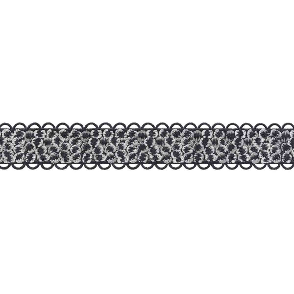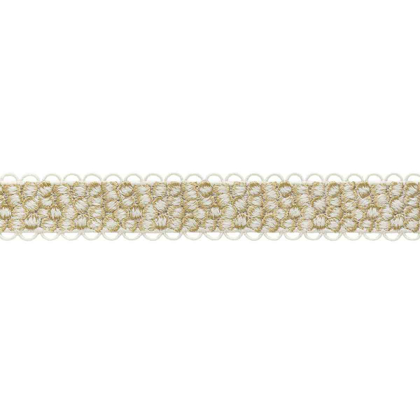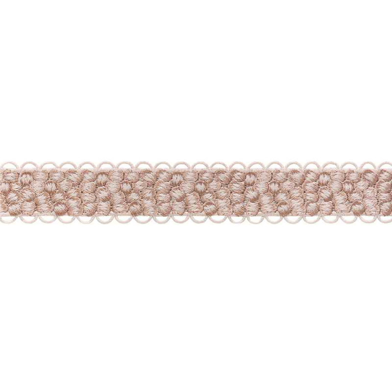 Le Galon Icona présente un motif géométrique, dessiné par l’alternance de petits cercles brodés, enserrés dans une trame étroite. Ce ruban de passementerie signé Houlès s’achève sur de fines bordures en arceaux réguliers, comme une dentelle ajourée. Le tissage confère à l’ensemble un relief doux et soyeux, au rythme équilibré. Il révèle un travail minutieux, ancré dans une esthétique sobre et structurée.