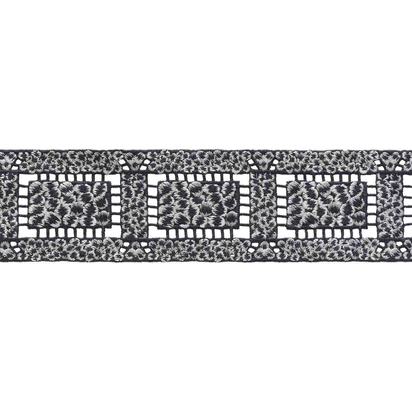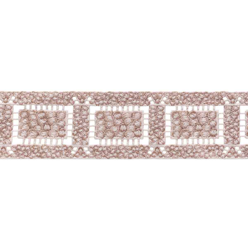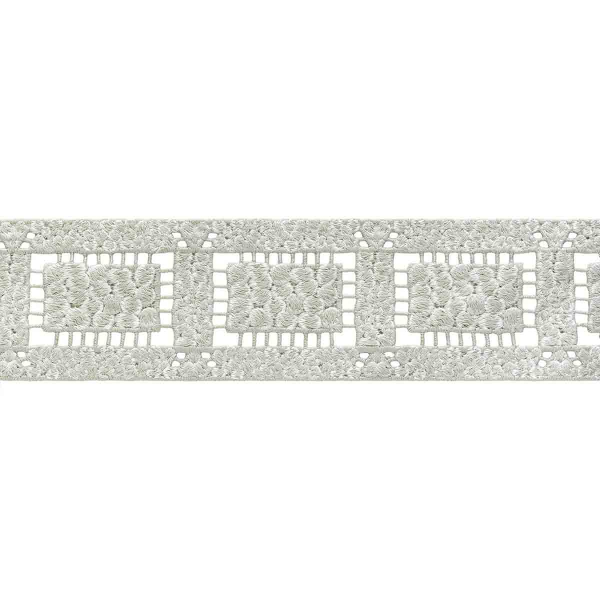 Houlès explore l’art de la broderie architecturée avec le galon Filigrane. Des cercles denses s’alignent au cœur de rectangles ajourés et composent un motif géométrique à la fois structuré et aéré. Chaque segment dessine un rythme régulier, entre pleins texturés et vides délicats. La main révèle un tissage sculptural, aux reliefs savamment ciselés.
