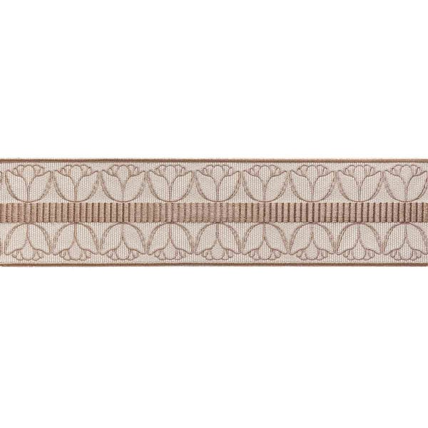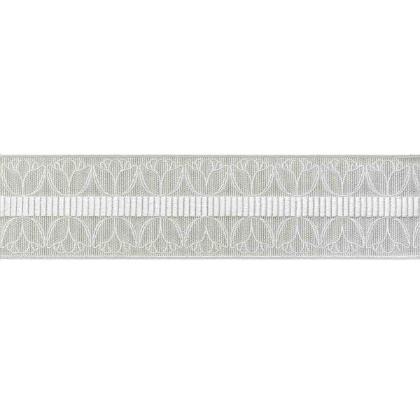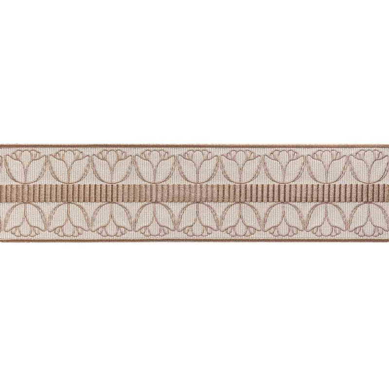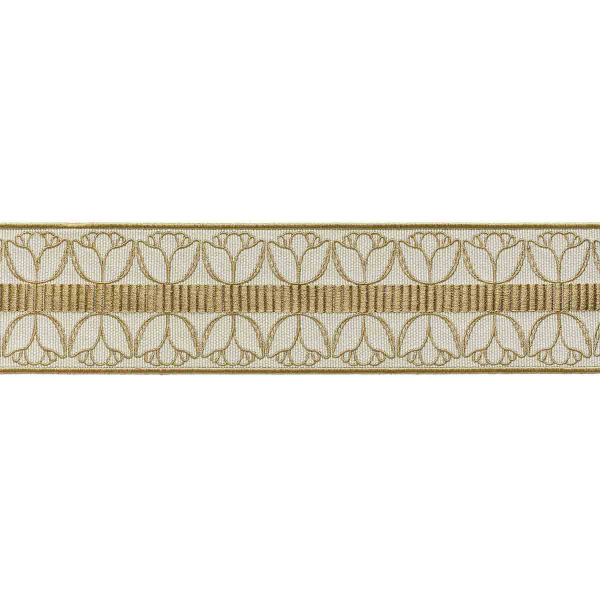 Le Galon Cornely revisite l’ornement textile avec un langage graphique raffiné. Signé Houlès, il associe un motif stylisé de tulipes brodées à une succession de rayures verticales, organisées autour d’un axe central. Le dessin se déploie sur une trame fine, soulignée par une bordure discrète qui équilibre la composition. L’ensemble évoque une rythmique douce, entre géométrie et floraison.