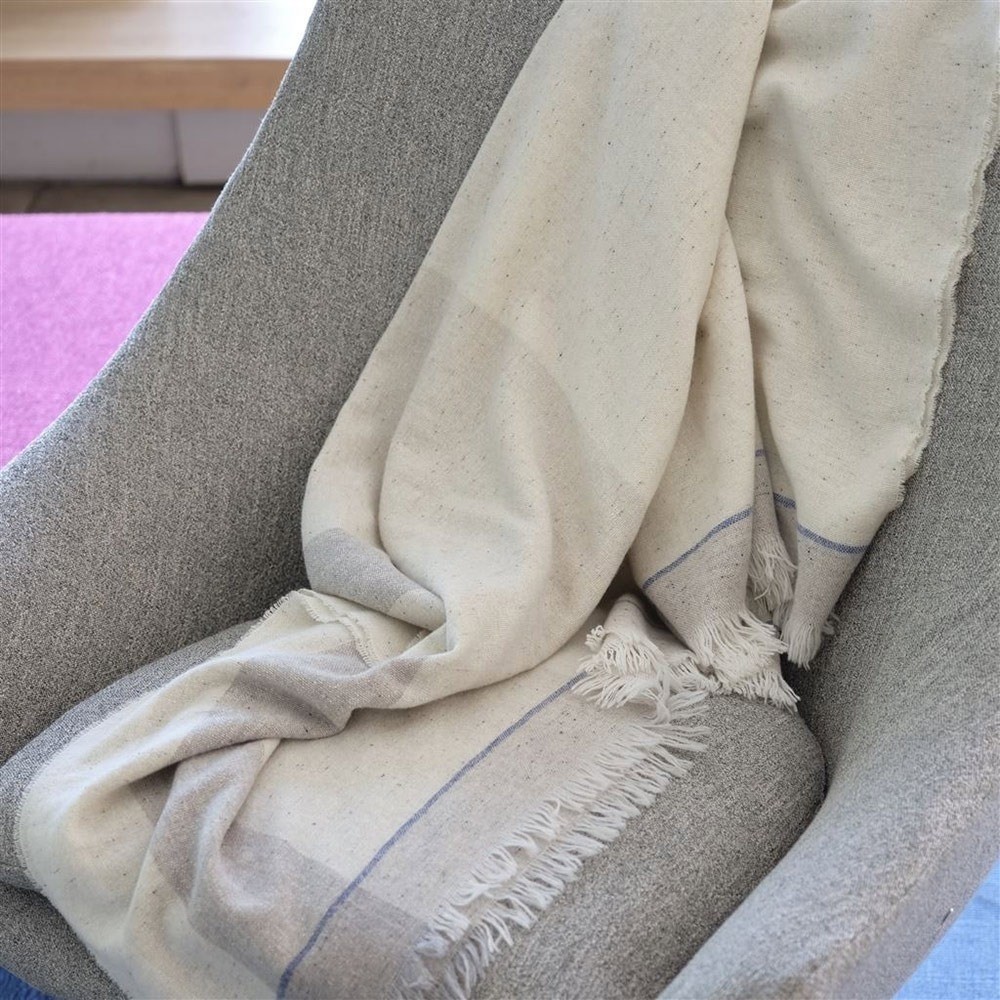 Minimaliste, le motif du plaid Burano Dove de Designers Guild se compose de lignes et de bandes légèrement colorées. Tissé avec des fils de haute qualité, cette création luxueuse est fabriquée dans des matériaux nobles, comme la soie et la laine mérinos recyclée, et se termine par des bords frangés.
