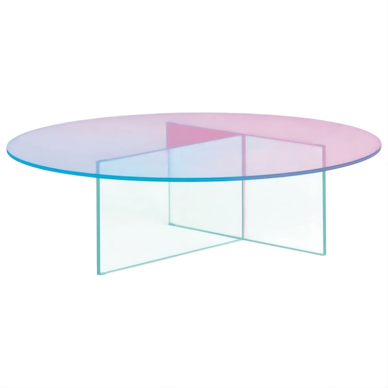 Éditée par Glas Italia, la table basse Shimmer compose une silhouette épurée en verre feuilleté et collé. Sa surface irisée, aux reflets multicolores, évolue au gré de la lumière et du regard. Des éclats mouvants dessinent une structure presque immatérielle. L’ensemble capture l’étrangeté silencieuse d’un mirage, entre illusion visuelle et profondeur tactile.