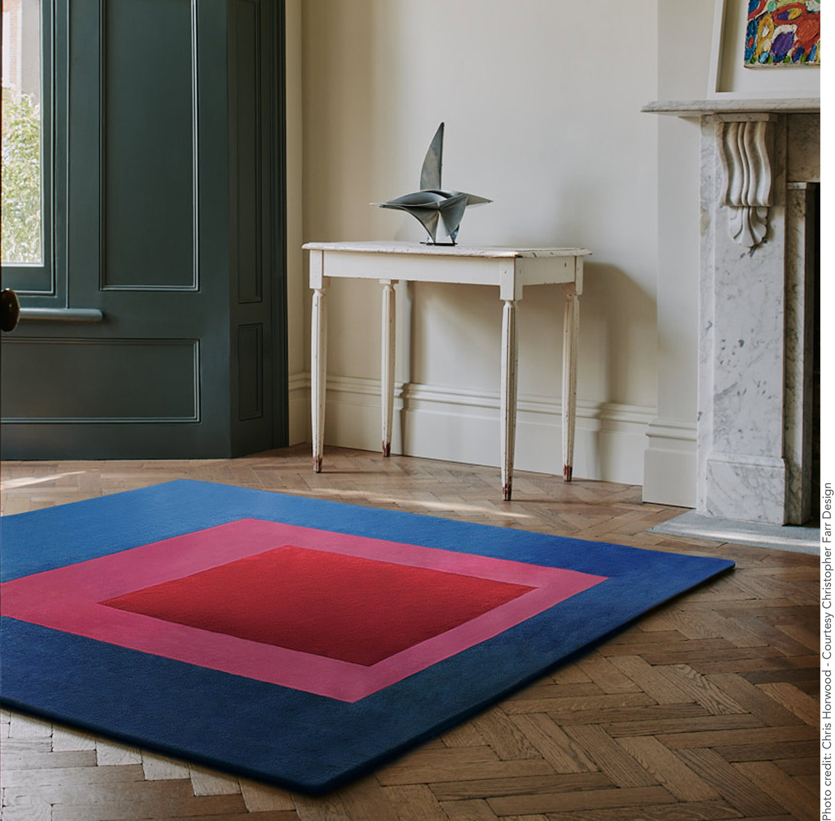 Précurseur de l'Op Art, Josef Albers est un peintre et théoricien d'art ayant enseigné en qualité de "maître" au Bauhaus jusqu'à sa fermeture par les nazis en 1933. Il poursuit sa carrière d'enseignant aux Etats-Unis tout en menant ses propres recherches artistiques. Au travers de la série "Homage to the Square" il étudie l'interaction des couleurs entre elles lorsque des applats de couleurs juxtaposés dans des carrés concentriques créent une illusion de recul ou d'avancement. Le tapis Full, composé de laine teinte à la main, est issu de cette série en une adaptation fidèle d'un dessin de 1962 développé en collaboration avec la fondation Joseph et Anni Albers.