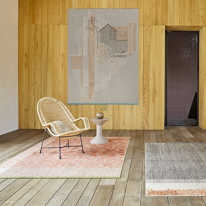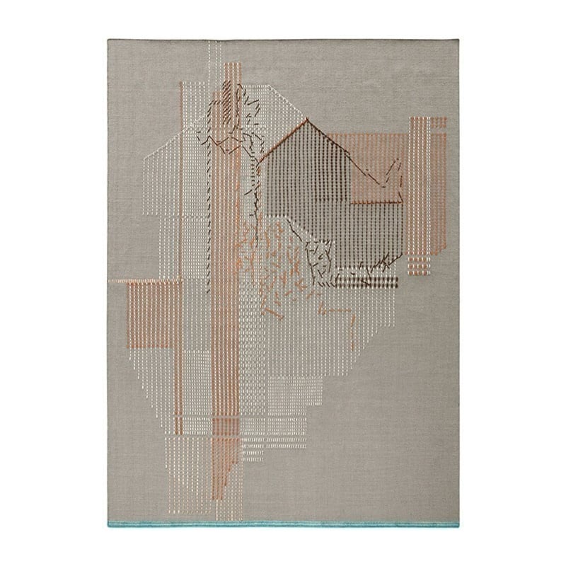 Gan Rugs highlights handmade embroidery in the design of the Backstitch Composition Brick rug. Woven like a Kilim in pure wool, this creation offers a pleasant touch. Its stitching with thick threads and its raw edge make this model more aesthetic.