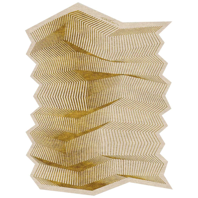 L’audace et l’énergie se ressentent à travers Info, un tapis en laine et en soie édité par Illulian. Il dynamise les espaces avec ses lignes aux accents dorés, qui semblent se plier pour former des zigzags. En créant ce motif visionnaire, Karim Rashid s’est inspiré de la mode et de l’architecture. L’ensemble séduit par son charme futuriste, réalisé avec la technique traditionnelle du nouage népalais.