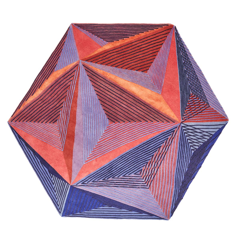 Le tapis Icosaedro signé Nodus se dévoile tel un polyèdre pop, éclatant de couleurs et chargé de mystères. Ses facettes riches, animées d’un ballet d’ombres et de lumières, lui confèrent une illusion de relief. Cette pièce en laine et en soie de bambou habille le sol d’une poésie contemporaine où chaque pas devient une exploration artistique.