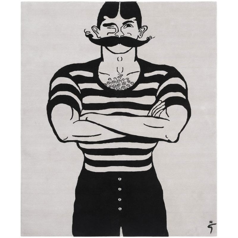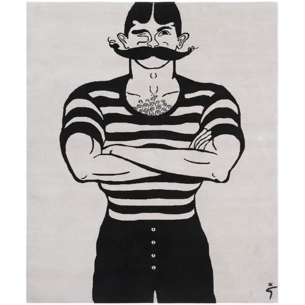 Avec les bras croisés et la moustache dressée, un personnage masculin se déploie sur le tapis Man. Le motif figuratif graphique rappelle les silhouettes de marins, entre illustration foraine et caricature rétro. Les contours nets tracent une forme de la vie balnéaire d’autrefois. Entièrement en laine, ce décor affirme l’esthétique audacieuse de la maison Amini.
