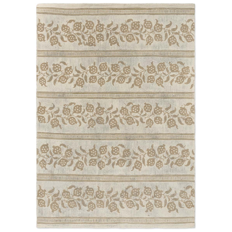 Un agencement régulier de frises compose le motif végétal et géométrique du tapis Anaar. Des grenades stylisées, entourées de feuilles et de tiges sinueuses, s’étendent sur toute la surface. De fines bandes ornementales rythment l’ensemble avec précision. Tufté main en laine, ce modèle signé Sanderson associe richesse graphique et texture naturellement chaleureuse.