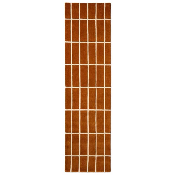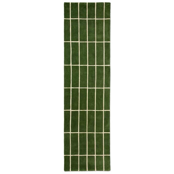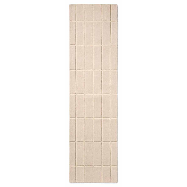 Le tapis couloir Tiiliskivi de Marimekko affiche un motif géométrique formé par une succession de carreaux réguliers, tracés avec précision. Des rectangles créent un quadrillage rythmé qui structure la composition avec rigueur. La surface révèle un relief doux qui souligne la netteté des lignes. Entièrement en laine, cette pièce déploie une matière dense et vivante qui ancre durablement sa présence au sol