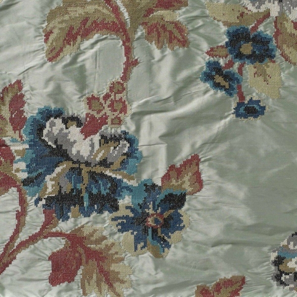 Madeleine est une soie Nobilis ornée d'un grand motif de fleurs au point compté. L'effet tapisserie du dessin associé à l'éclat du satin offre un aspect rétro et précieux à l'ensemble.