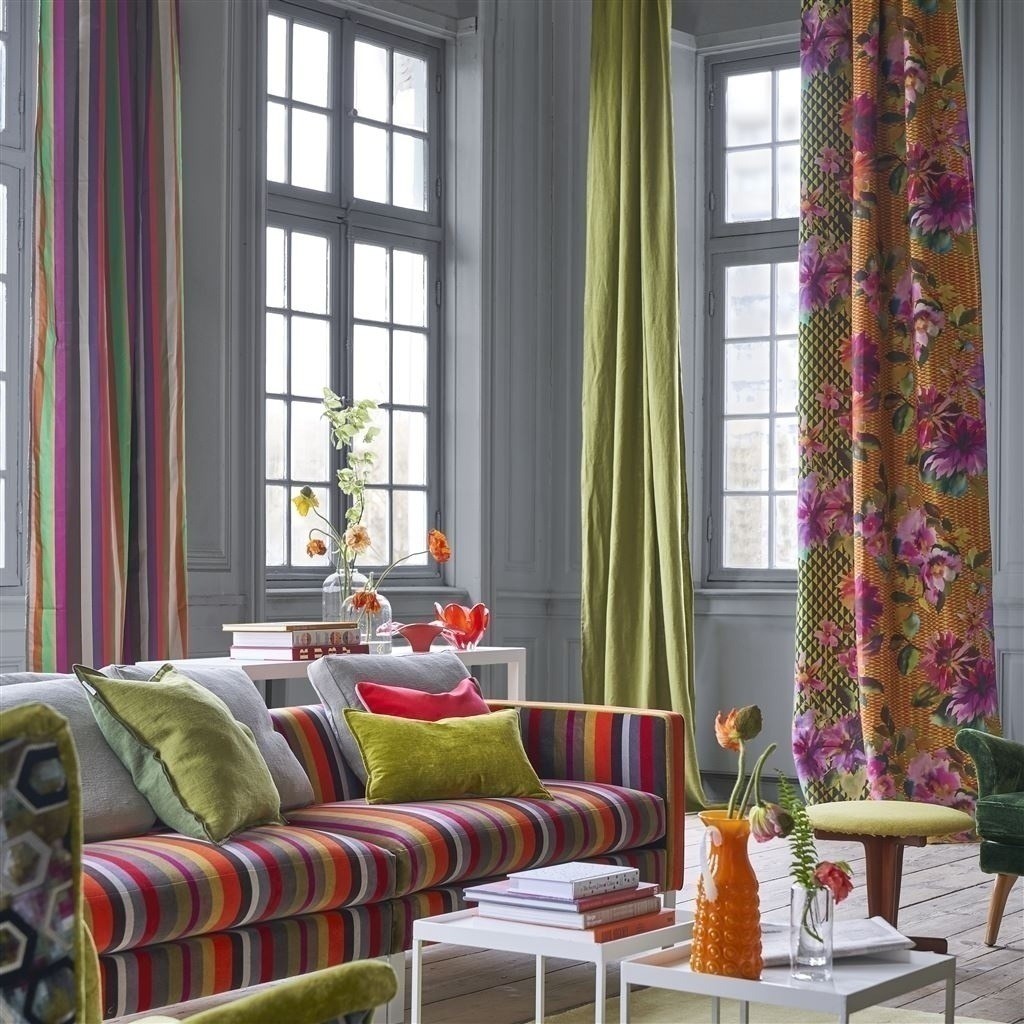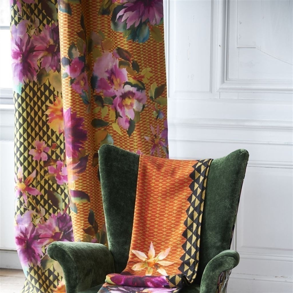 Le motif floral du tissu Manchu se dessine sur un fond en deux parties. D'un côté, des losanges s'alignent et forment un treillis. De l'autre, des triangles aux couleurs analogues s'empilent et génèrent un léger effet tridimensionnel. Les teintes chaudes et vives de ce tissus conçu par Designers Guild illumine votre pièce.