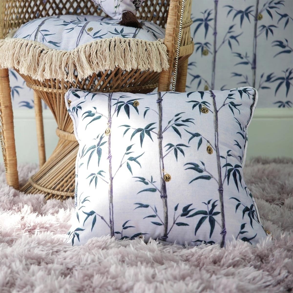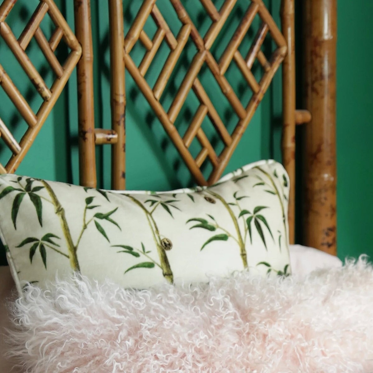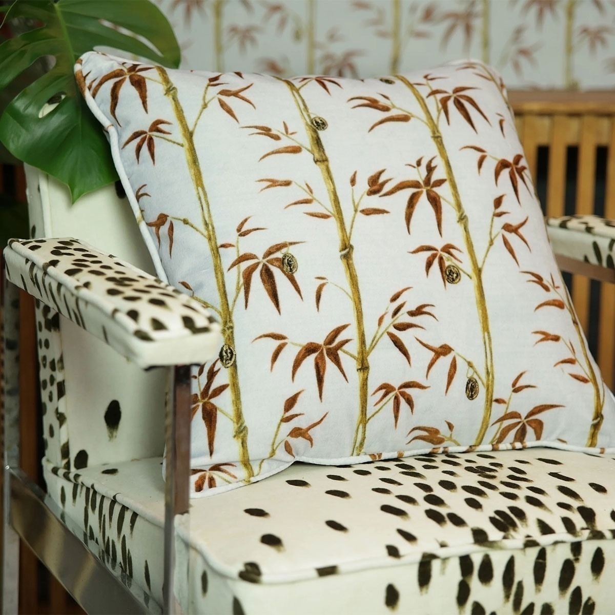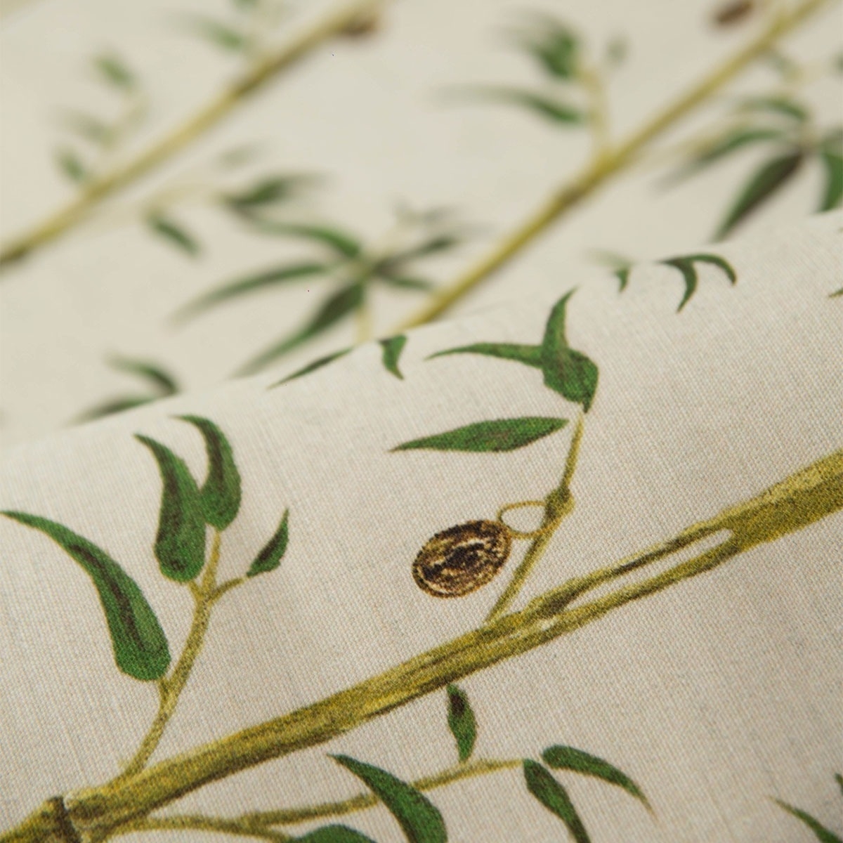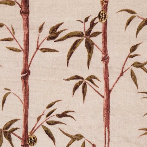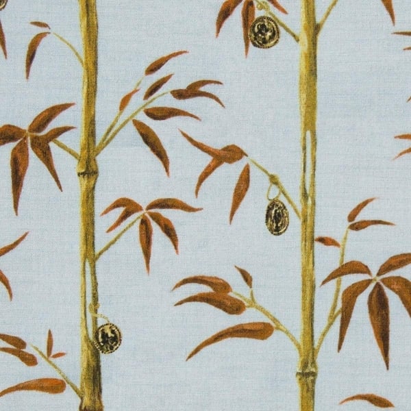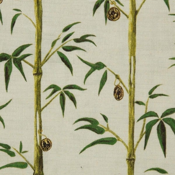 Le tissu Money Tree de Poodle and Blonde représente des tiges de bambous où sont suspendues des pièces d'or. Il est inspiré d’une histoire où un grand-père raconte à ses petits-enfants que l’argent pousse dans les arbres. Tissée en lin, cette étoffe affiche une allure élégante et légère.