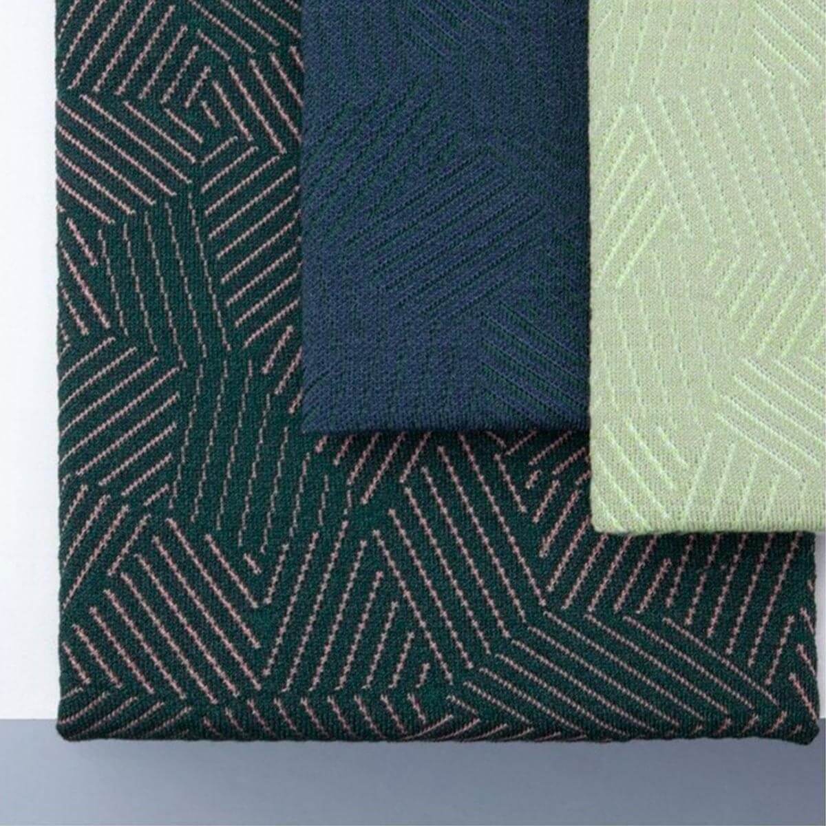 Nommé après la technique de peinture de camouflage, le tissu Razzle Dazzle met en avant un tricot en laine de traits entrecoupés. Le designer belge Sylvain Willenz collabore avec Febrik, proposant ce textile riche et audacieux. Ce faux-uni dispose d'un tombé magnifique et d'une résistance remarquable.