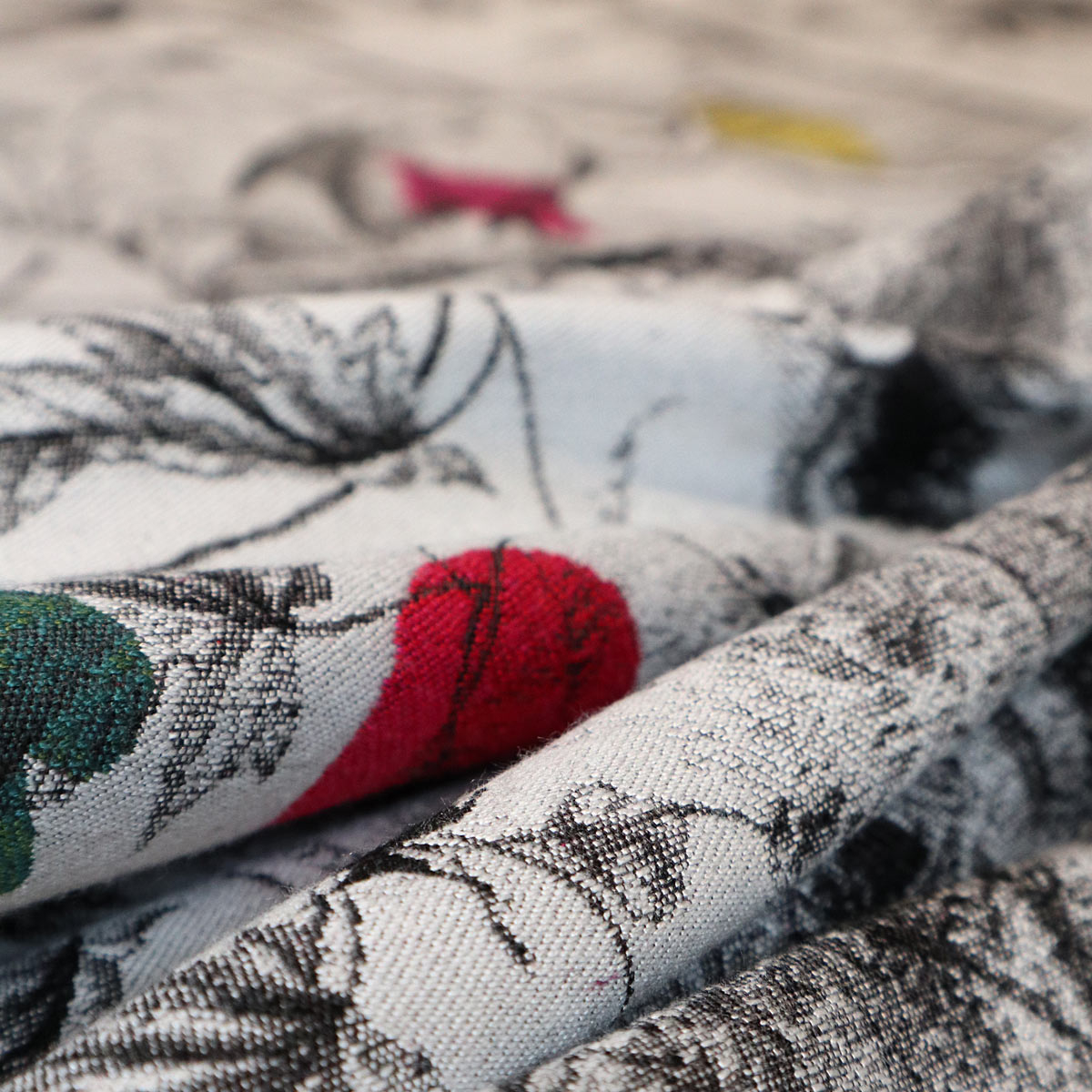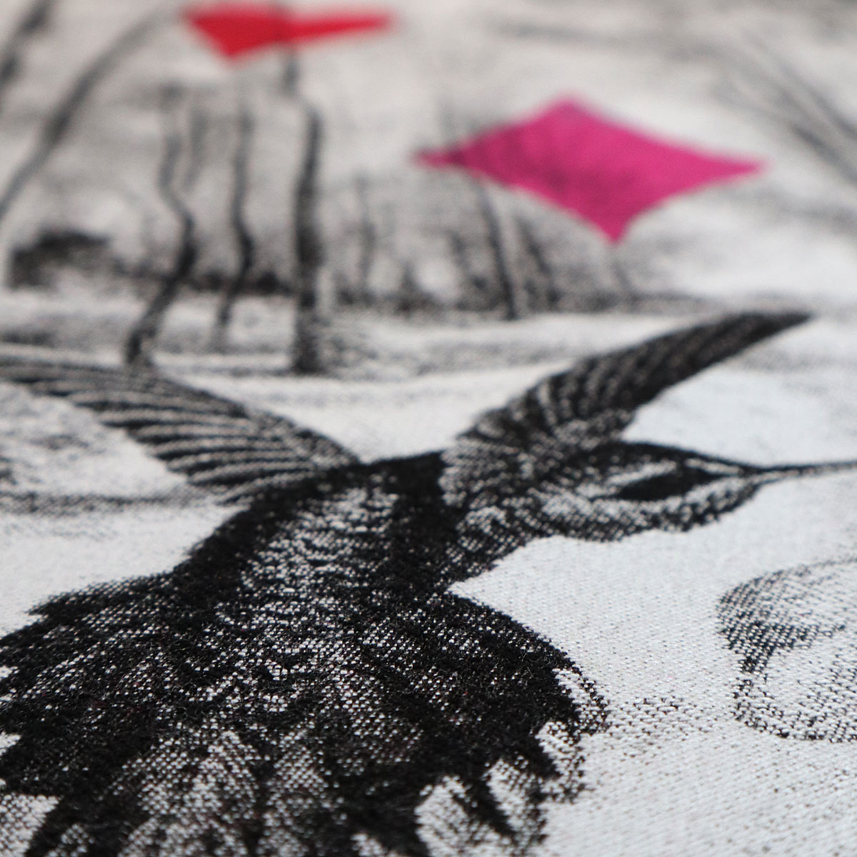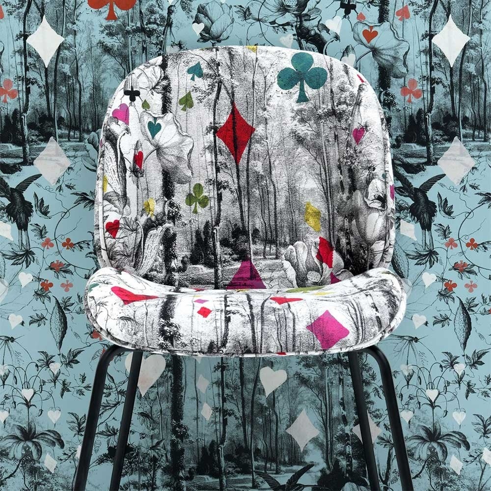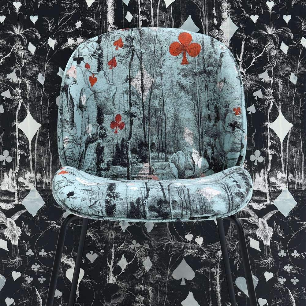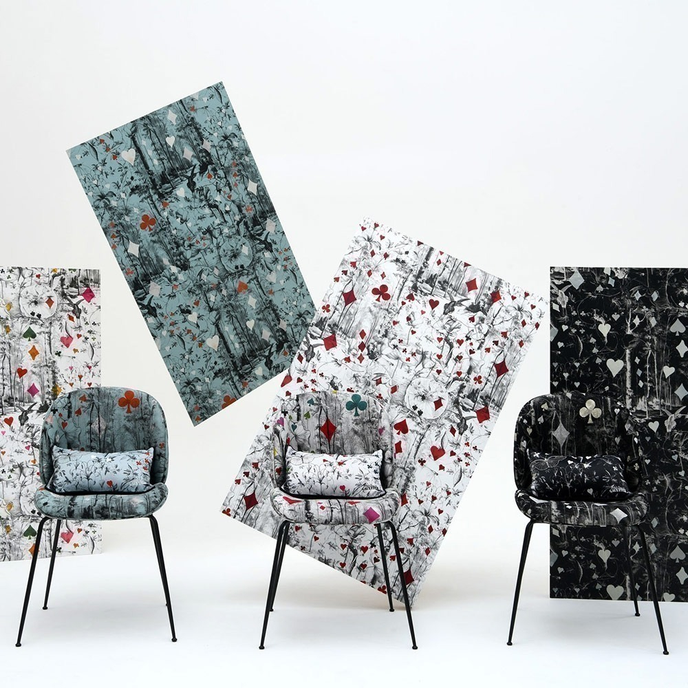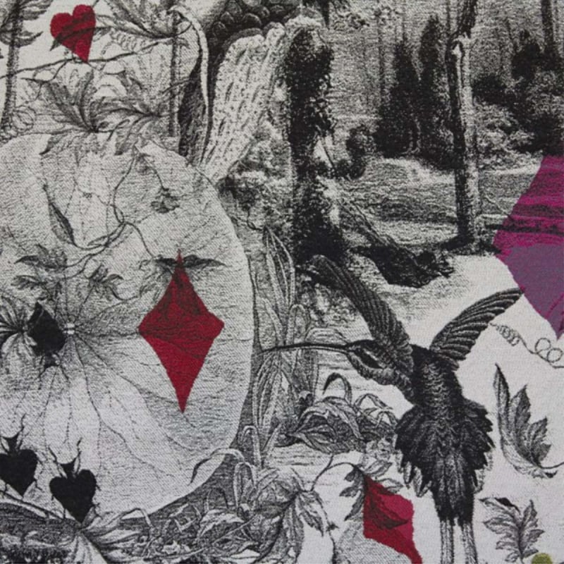Une forêt enchantée, des animaux mystérieux et des symboles de cartes à jouer composent le motif de Tarot. Ce jacquard aux couleurs neutres intrigue. Ce tissu est une création Jean Paul Gaultier.