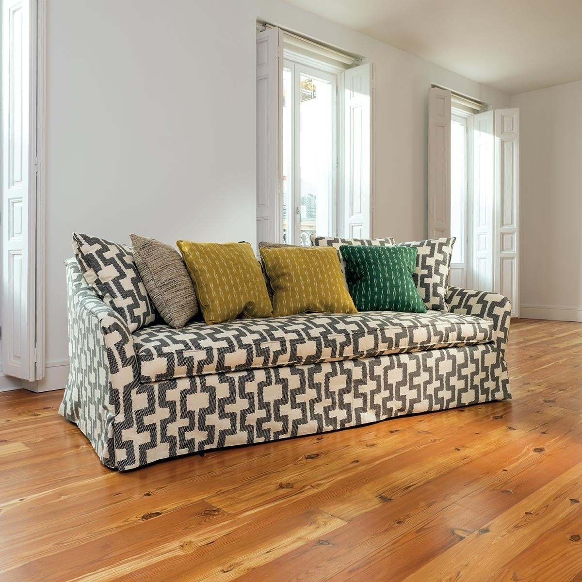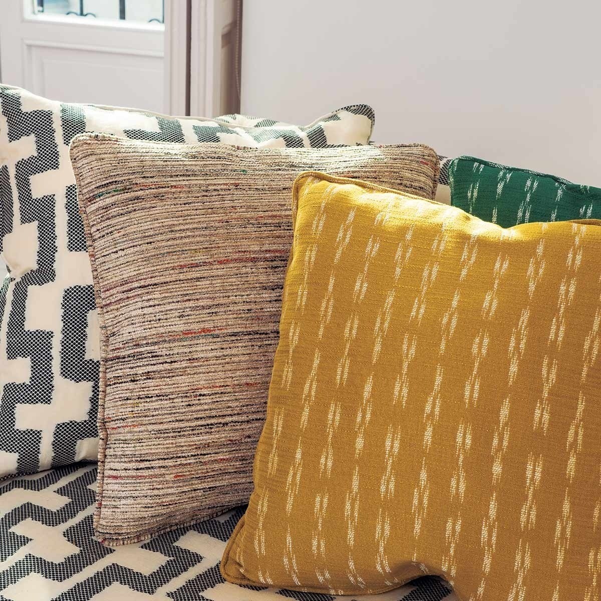Gaston Y Daniela propose un motif ethnique à travers le jacquard Yoko. Il met en avant des figures abstraites dessinées dans une nuance claire qui contrastent avec la teinte du fond uni. Présentant un tissage légèrement apparent, cette étoffe offre un toucher doux.