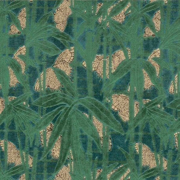 Nobilis combine le tissage bouclé et le jacquard dans la création du velour Farfalla. Il met en avant un motif floral composé de bambous ornés de larges feuilles. Quelques papillons brillants complètent le design d’une note d’élégance. Cette étoffe agréable au toucher offre également une bonne résistance.