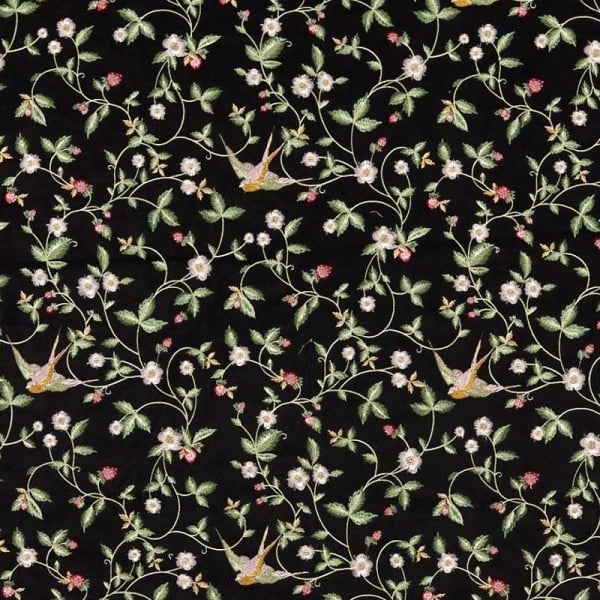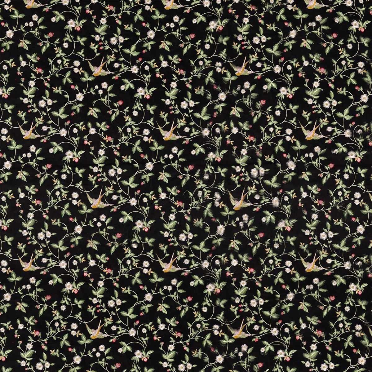 Clarke and Clarke propose un dessin datant de 1964. Un magnifique motif retranscrivant les sensations d’un été anglais. Sur un délicat velours est brodée une représentation d’un fraisier. D'impertinents oiseaux sauvages viennent y picorer les fruits. La broderie lui confère un surprenant relief grâce à un fil qui capte la lumière.