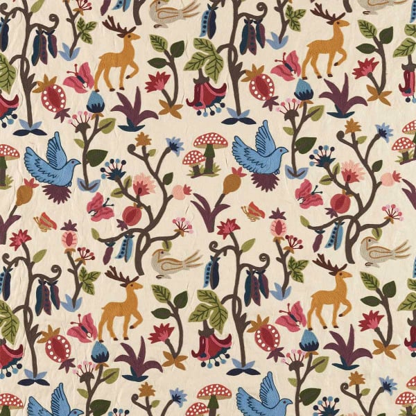 Forest of Dean est une représentation enchanteresse d’une forêt centenaire. Sur une étoffe de lin, est brodé un motif végétale et animale. Sanderson imagine une représentation presque enfantine pour ce tissu d'ameublement. Les fils mats apportent une esthétique forte à ce dessin de cerfs, de fougères et de papillons. Il est idéal pour la confection de stores et de rideaux.