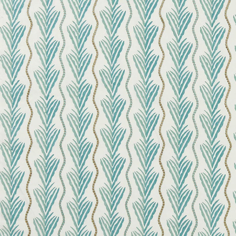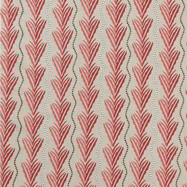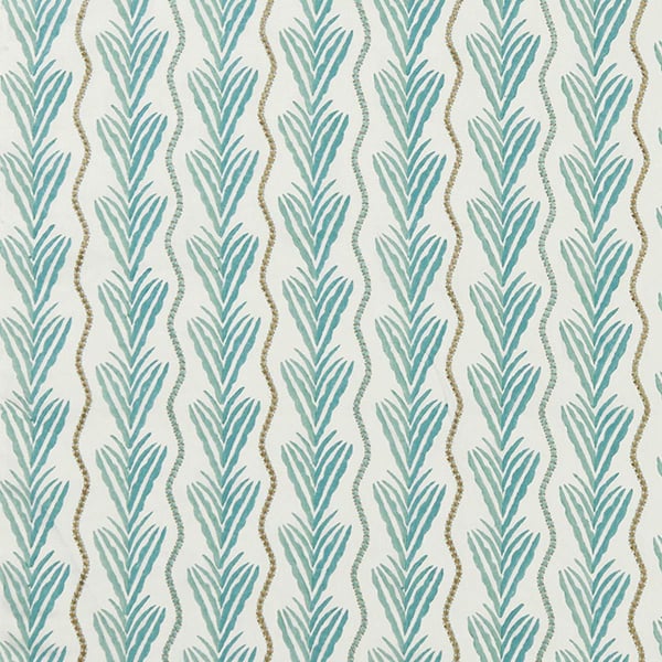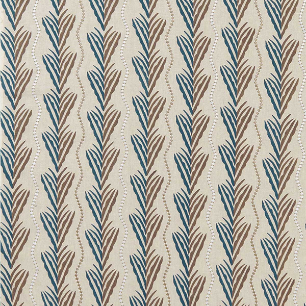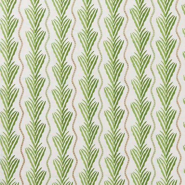 Le tissu Méridor évoque le feuillage dressé d'un poireau du même nom, une variété cultivée en Val de Loire en France. Les feuilles sont disposées en deux séries opposées, comme un éventail. Un lacet soyeux au reflet brillant, brodé en point de couchage, égaie les figures. Osborne and Little propose ici un textile léger en lin naturel et aux couleurs douces.