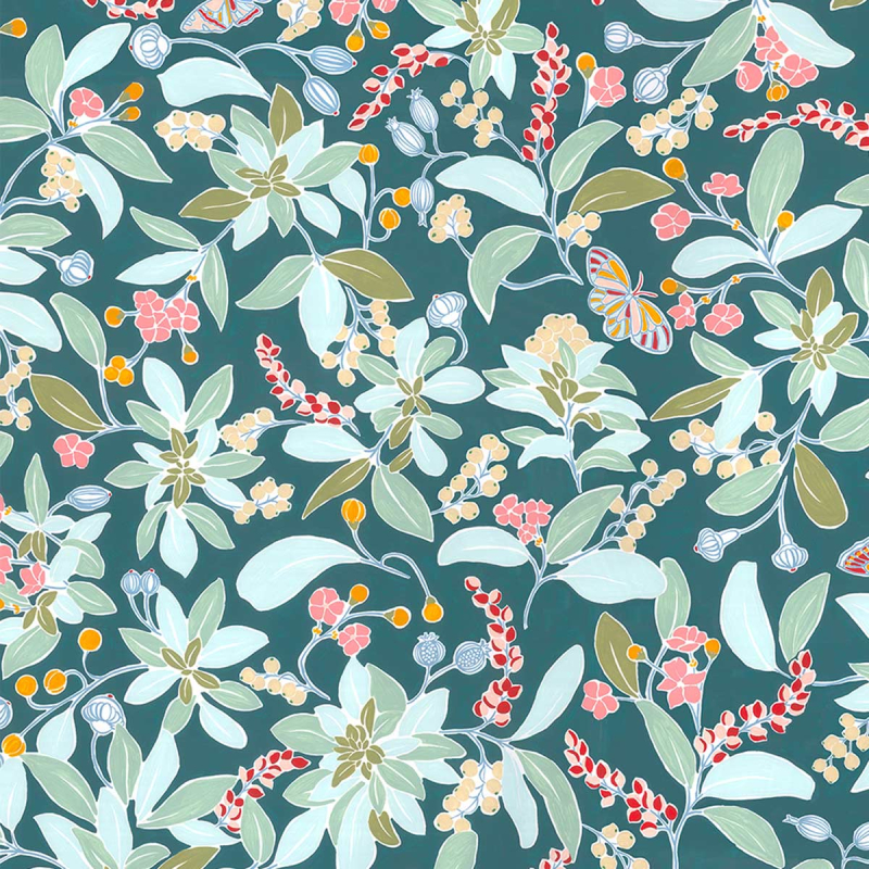 Révélant un motif végétal contemporain, le motif du tissu Sophia est une création signée Claire de Quénetain. Dessinées dans des couleurs vives sur un un fond vert canard profond, les figures florales habillent les éléments d’une touche joyeuse et estivale