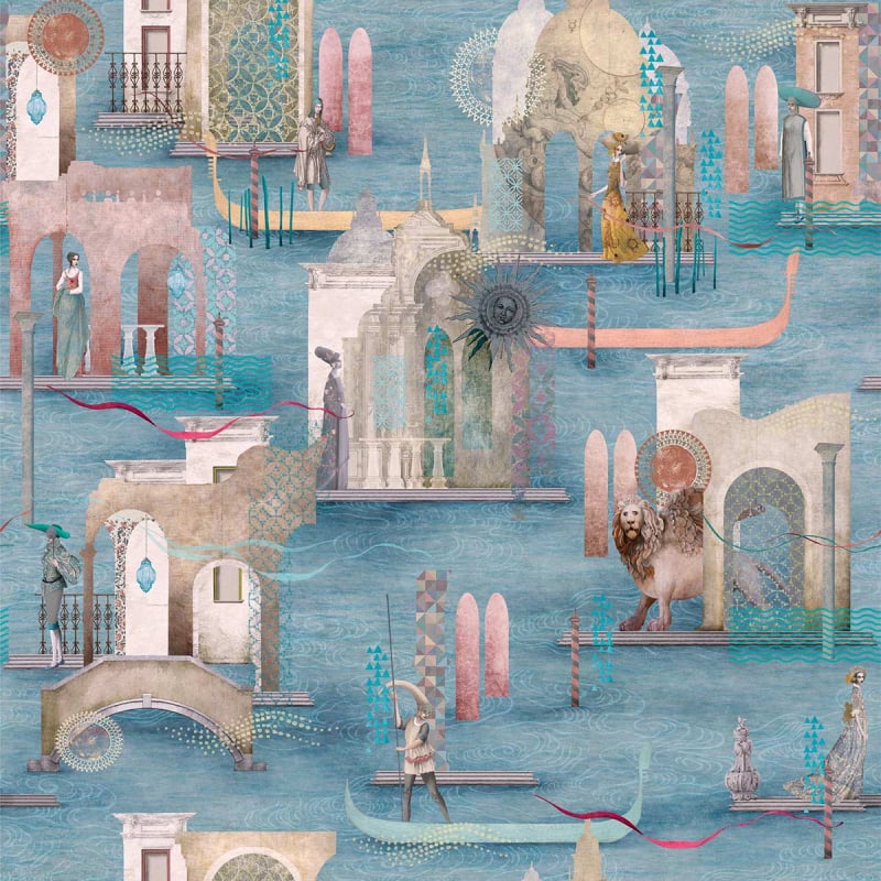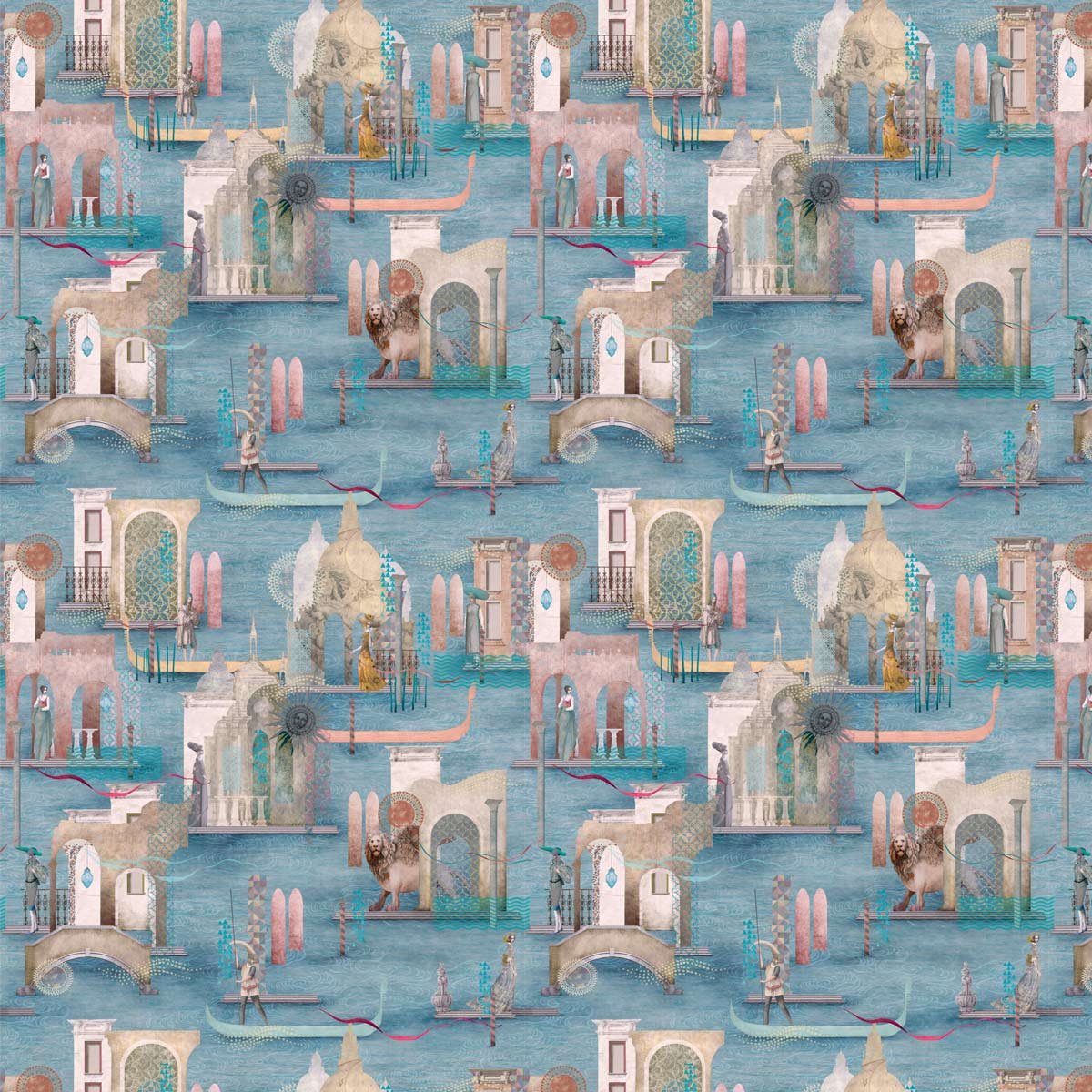 En un doux ballet de motifs, Veniceland révèle une scène théâtrale où chaque élément joue son rôle. Telle une tour kaléidoscopique, ce tissu évoque une Venise flamboyante. Gondole, ducs-d'Albe, masques, ponts, architectures vénitiennes et verres de Murano s'entrelacent autour du lion ailé, symbole de la ville lagunaire. Inspiré par Venise et le trait de Gabriel Pacheco, dessinateur mexicain, ce tissu imprimé capture l'esprit éclectique et vibrant de la Cité des Doges.
