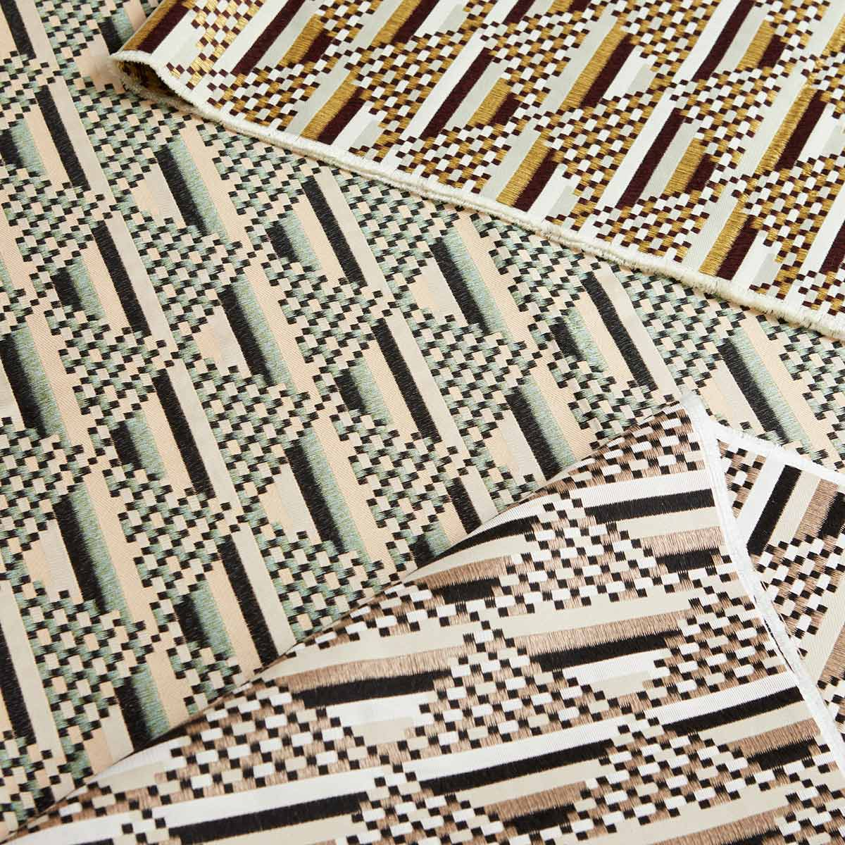 Inspiré par l’art de la joaillerie, le tissu Betsy brille de fils étincelants qui évoquent l'éclat précieux des bijoux. Son design géométrique, méticuleusement élaboré, se forme par un tissage complexe et polychrome. Sa surface offre une texture opulente grâce à ses multiples armures, ajoutant ainsi une dimension tactile à son tombé gracieux. Imprégné d’un air ethnique, Betsy décore les intérieurs d’une note vibrante et d’une symphonie visuelle captivante.