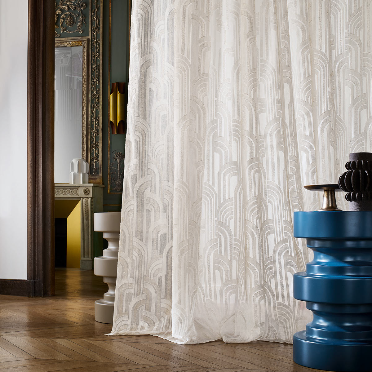 Le motif géométrique de Lusson se révèle à partir d’un jeu de transparence. Constitué de lignes et de formes imbriquées, ce design structural évoque un style résolument contemporain, souligné par l’effet de matière. Conçu par la maison Casamance, ce voile raffiné emprunte un ton clair et doux, ajoutant une touche lumineuse au décor.