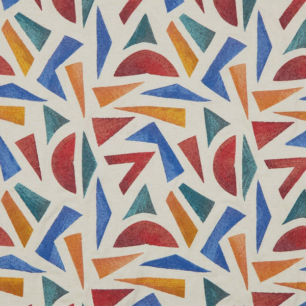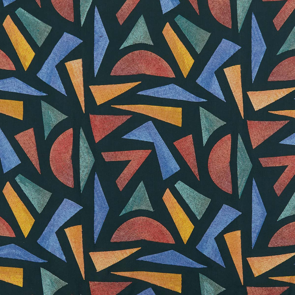 Le tissu Explosion, une idée de Federico Forquet réalisée par Liberty Design Studio, illustre des éclats ou fragments de verre coloré. Les débris multicolores, brodés sur toute la surface du textile, ont des formes géométriques inspiré du cubisme. Les fils de broderie créent ainsi de la profondeur et de la texture, outre leur effet d’ombre picturale.