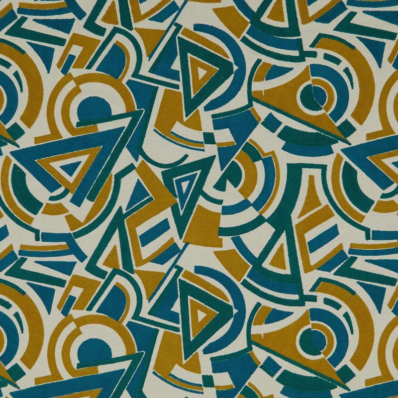 Liberty rend hommage à Bernard Nevill à travers Trepak Embroidery, un tissu épais inspiré de son iconique création Jazz  en 1965. Le motif, entièrement brodé avec des fils soyeux tricolores, présente un tourbillon de formes géométriques cassées. Leur sens giratoire évoque le vorticisme britannique, que le créateur Federico Foquet rehausse ici avec une saisissante broderie tridimensionnelle.