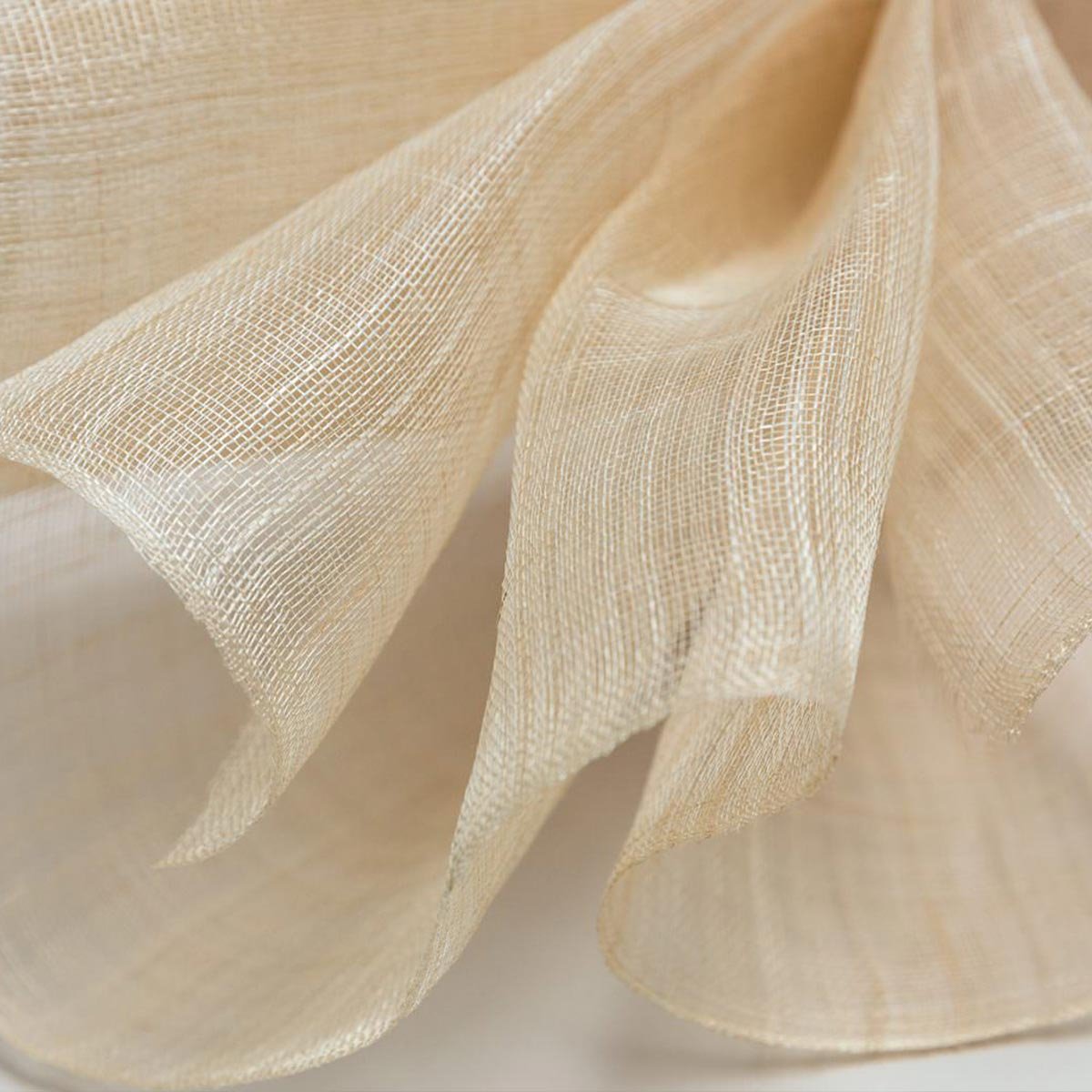 Le tissu Abaca Fish Net de CMO Paris, entièrement en fibres de bananier textile, séduit par sa surface lisse et brillante. Son tissage espacé permet une texture quasi-transparente, laissant passer la lumière. L’authenticité du chanvre de Manille est ici optimisée par ses teintes naturelles, variant de l’écru au marron.
