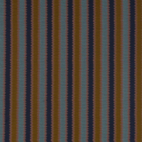 Bee Queen, édité par la maison italienne Etro, est un tissu dense avec une texture en chevron. Il présente des rayures verticales rythmées de différentes couleurs, réalisées au métier Jacquard. Les bords sont expressément floutés, afin de créer un aspect ikat. Les lignes semblent ainsi vibrer, et apportent du dynamisme aux espaces.
