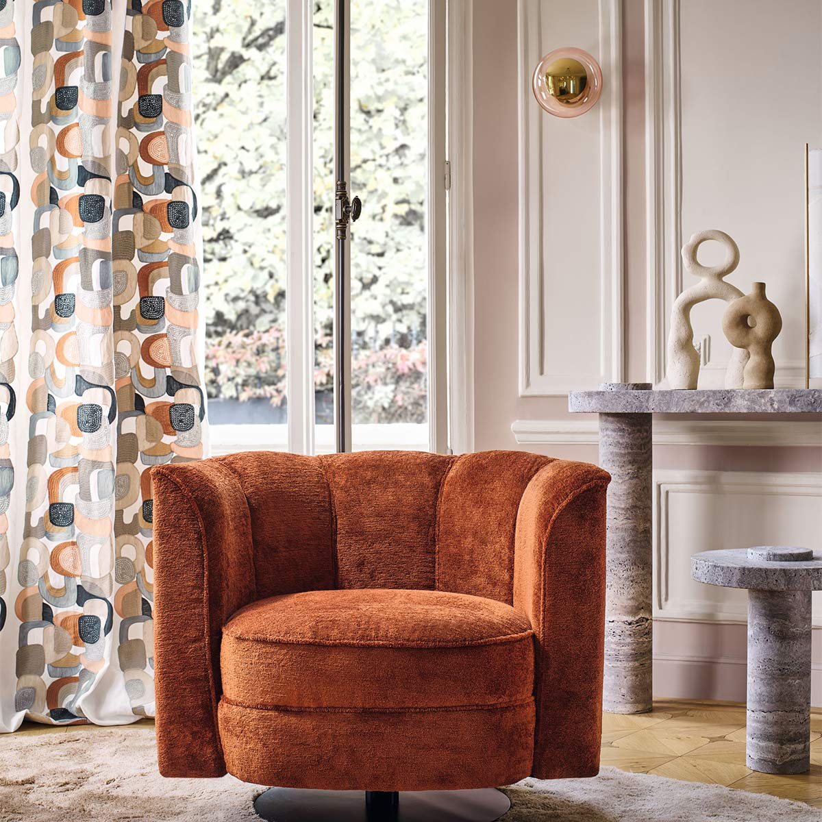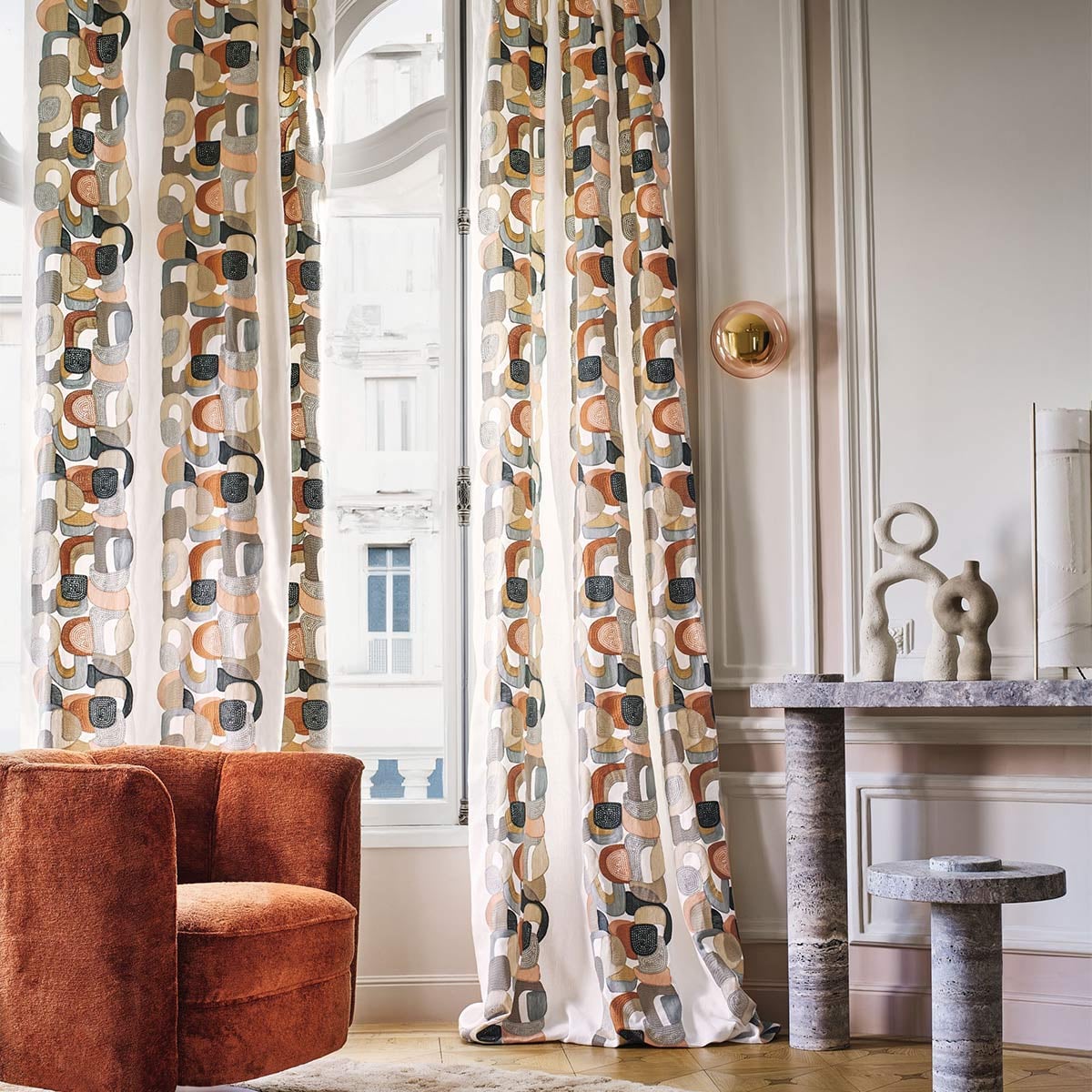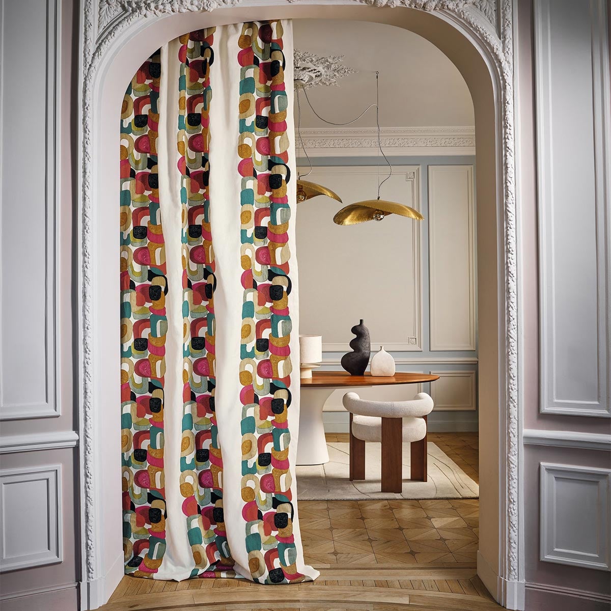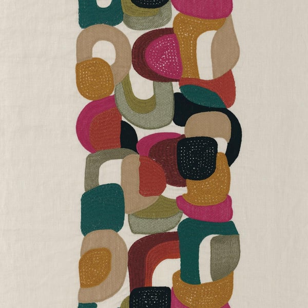 Le tissu en lin mat Convoitise de Casamance captive avec les tons vifs et la dense texture de sa broderie. Son motif abstrait évoque la douceur des formes arrondies, aux contours en point de chaînette. Les figures, brodées avec des fils brillants et laineuses, sont largement espacées. Leurs intervalles dévoilent le fond clair, créant en même temps un effet de rayures verticales.